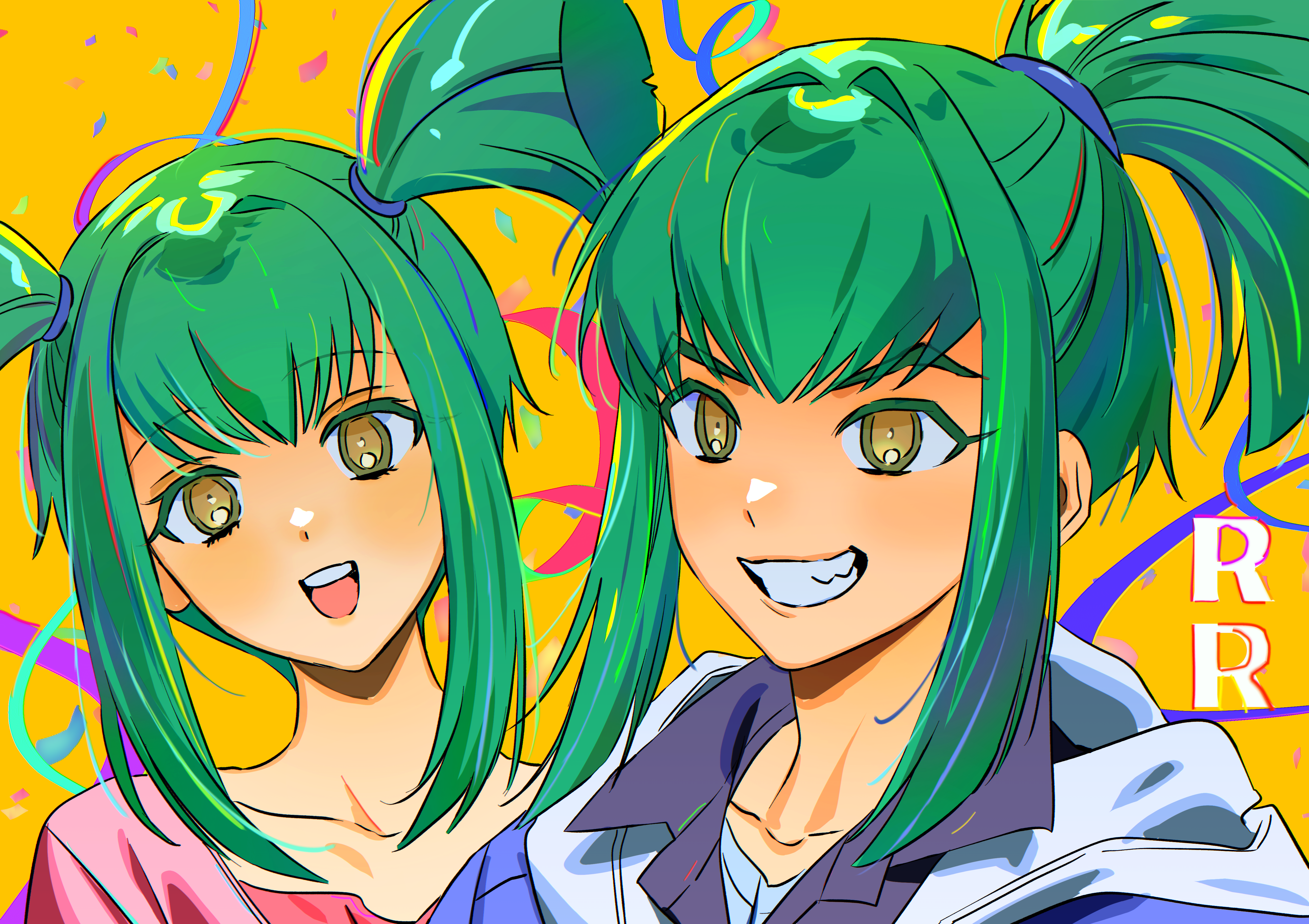 absurdres brother_and_sister green_hair highres lua_(yu-gi-oh!) luca_(yu-gi-oh!) ojing_oppa_(o_b_s_00) open_mouth siblings simple_background smile upper_body yellow_background yellow_eyes yu-gi-oh! yu-gi-oh!_5d's