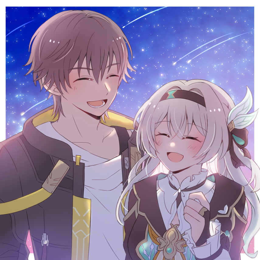 1boy 1girl black_jacket black_ribbon bridal_gauntlets caelus_(honkai:_star_rail) closed_eyes collared_shirt firefly_(honkai:_star_rail) gradient_hair grey_hair hair_between_eyes hair_intakes hair_ornament hair_ribbon hairband honkai:_star_rail honkai_(series) jacket long_hair multicolored_hair neckerchief nekozawa open_clothes open_jacket open_mouth orange_neckerchief ribbon shirt shooting_star short_hair single_bridal_gauntlet sky smile star_(sky) starry_sky teeth trailblazer_(honkai:_star_rail) white_shirt