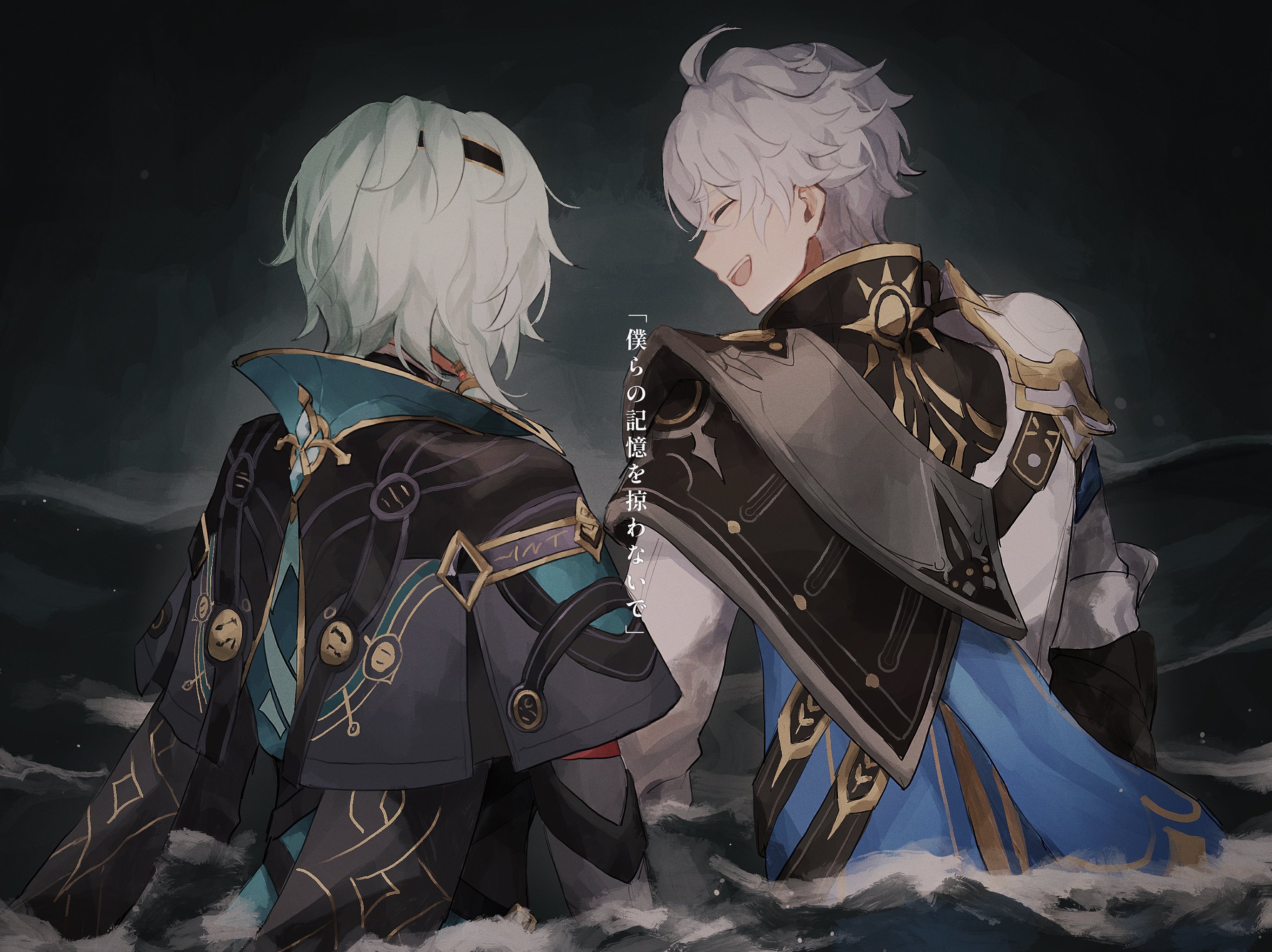 2boys anaxa_(honkai:_star_rail) aqua_hair back closed_eyes fz7047 grey_hair highres honkai:_star_rail honkai_(series) male_focus medium_hair multiple_boys ocean open_mouth phainon_(honkai:_star_rail) short_hair side_ponytail smile teeth translation_request upper_teeth_only