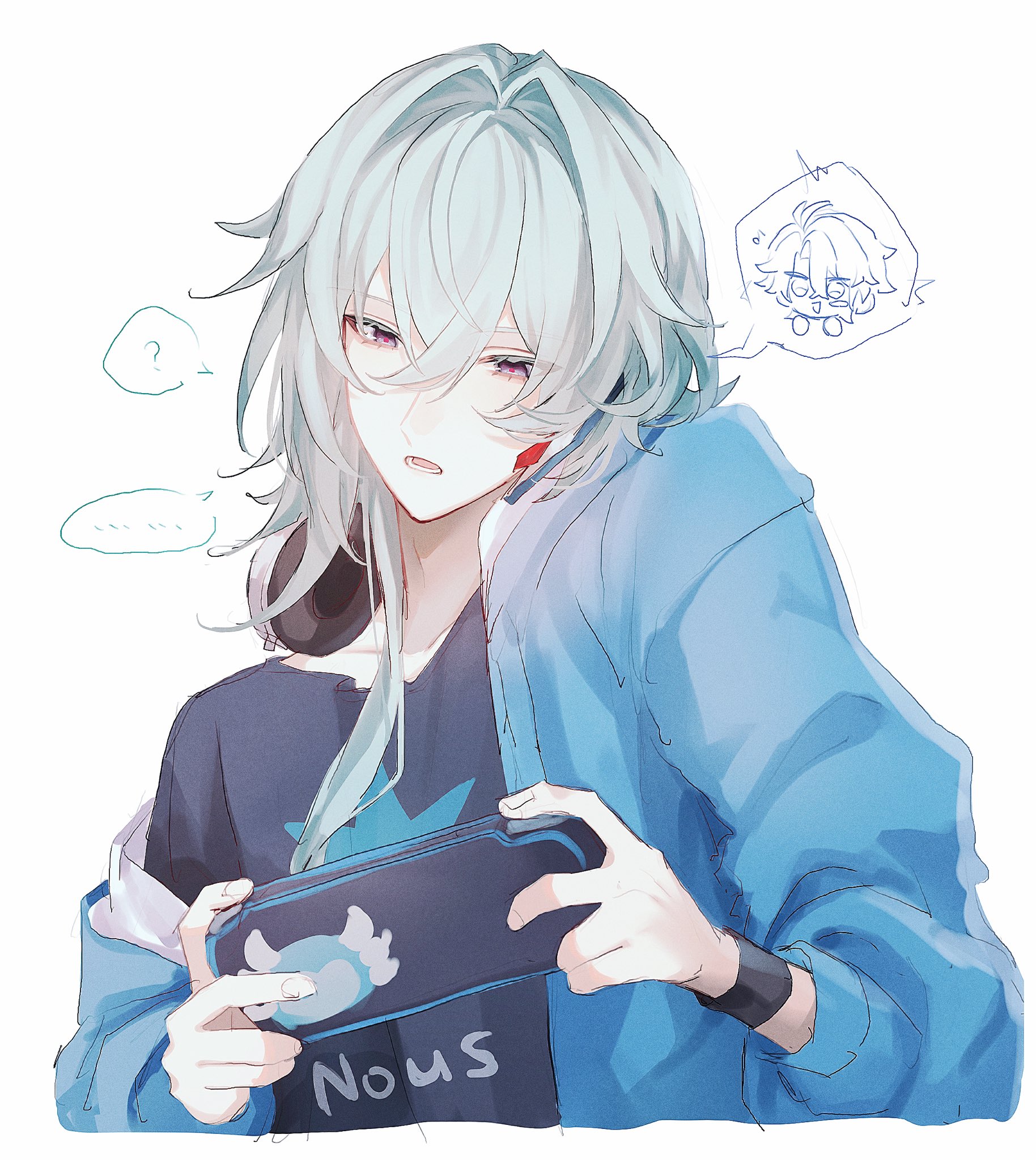 2boys anaxa_(alternate_spacetime)_(honkai:_star_rail) anaxa_(honkai:_star_rail) aqua_hair black_shirt blue_eyes blue_jacket casual fz7047 hair_between_eyes handheld_game_console highres holding holding_handheld_game_console honkai:_star_rail honkai_(series) jacket male_focus multiple_boys open_mouth phainon_(honkai:_star_rail) pink_pupils shirt simple_background solo_focus upper_body white_background
