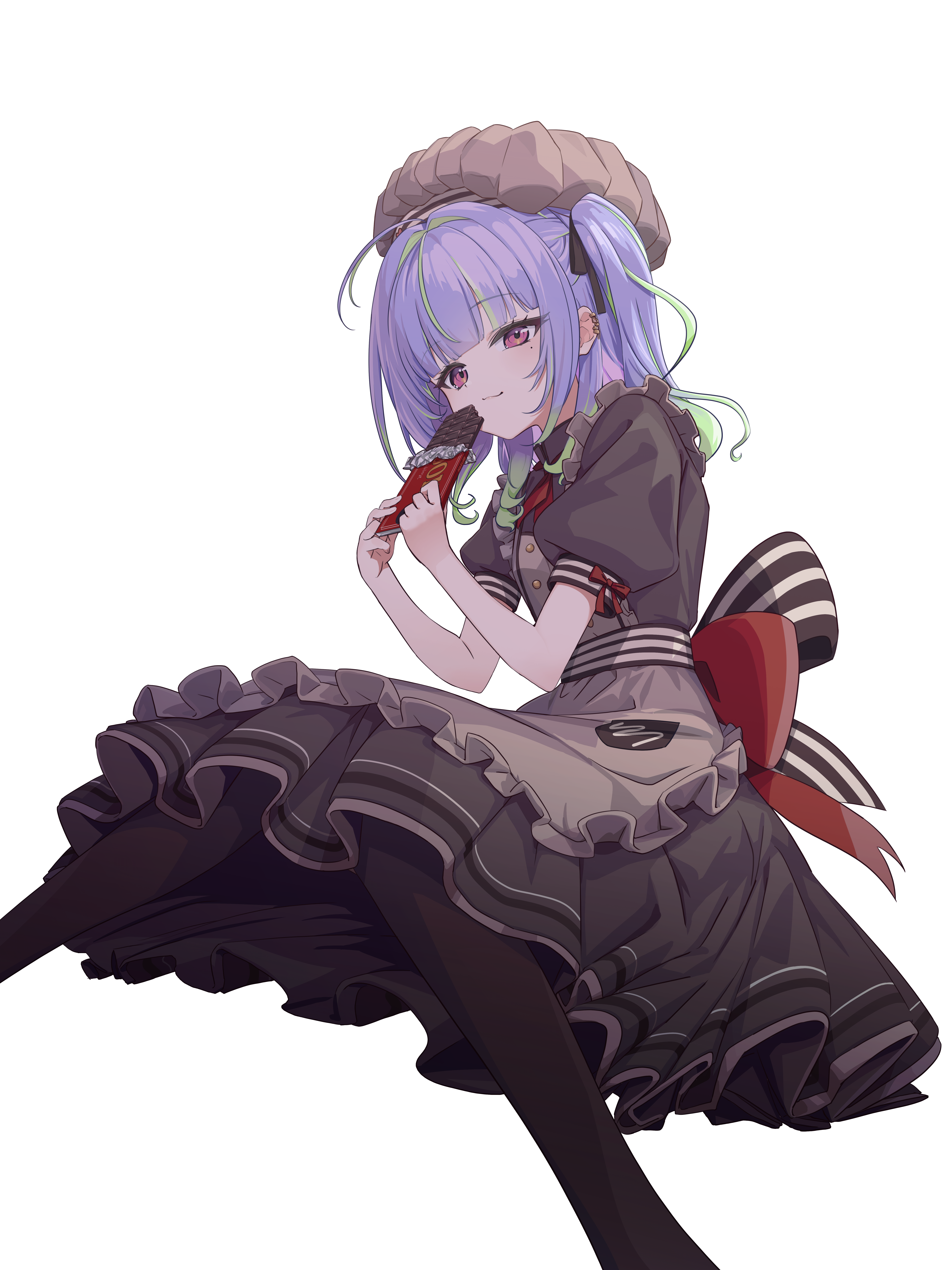 1girl absurdres ahoge alternate_costume apron back_bow black_pantyhose blue_hair bow candy chocolate chocolate_bar closed_mouth dress feet_out_of_frame food frilled_apron frilled_dress frills green_hair grey_apron grey_dress grey_hat hat highres looking_at_viewer medium_hair mob_cap mole mole_under_eye multicolored_hair nanashi_inc. ougimaneki pantyhose pink_eyes puffy_short_sleeves puffy_sleeves red_bow short_sleeves simple_background smile solo suzumi_nemo transparent_background two-tone_hair two_side_up variant_set virtual_youtuber