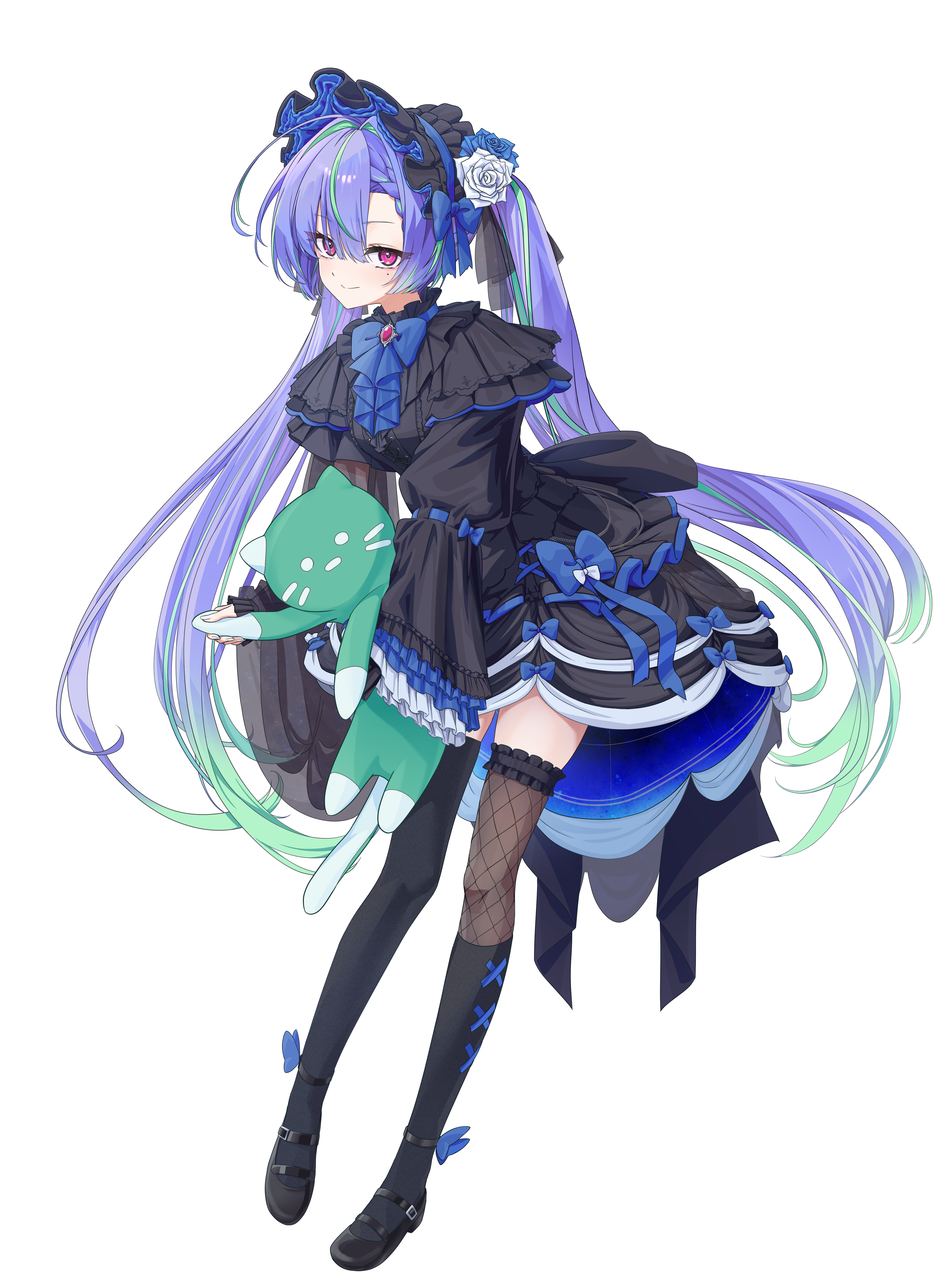 1girl absurdres alternate_costume black_bonnet black_dress black_shoes black_thighhighs blue_bow blue_bowtie blue_flower blue_hair blue_rose bonnet bow bowtie brooch closed_mouth commentary_request dress fishnet_thighhighs fishnets flower frilled_sleeves frills full_body gothic_lolita green_hair hair_bow highres jewelry lolita_fashion long_hair looking_at_viewer mary_janes mole mole_under_eye multicolored_hair nanashi_inc. ougimaneki pink_eyes rose shoes simple_background smile solo stuffed_animal stuffed_cat stuffed_toy suzumi_nemo thighhighs transparent_background two-tone_hair very_long_hair virtual_youtuber white_flower white_rose