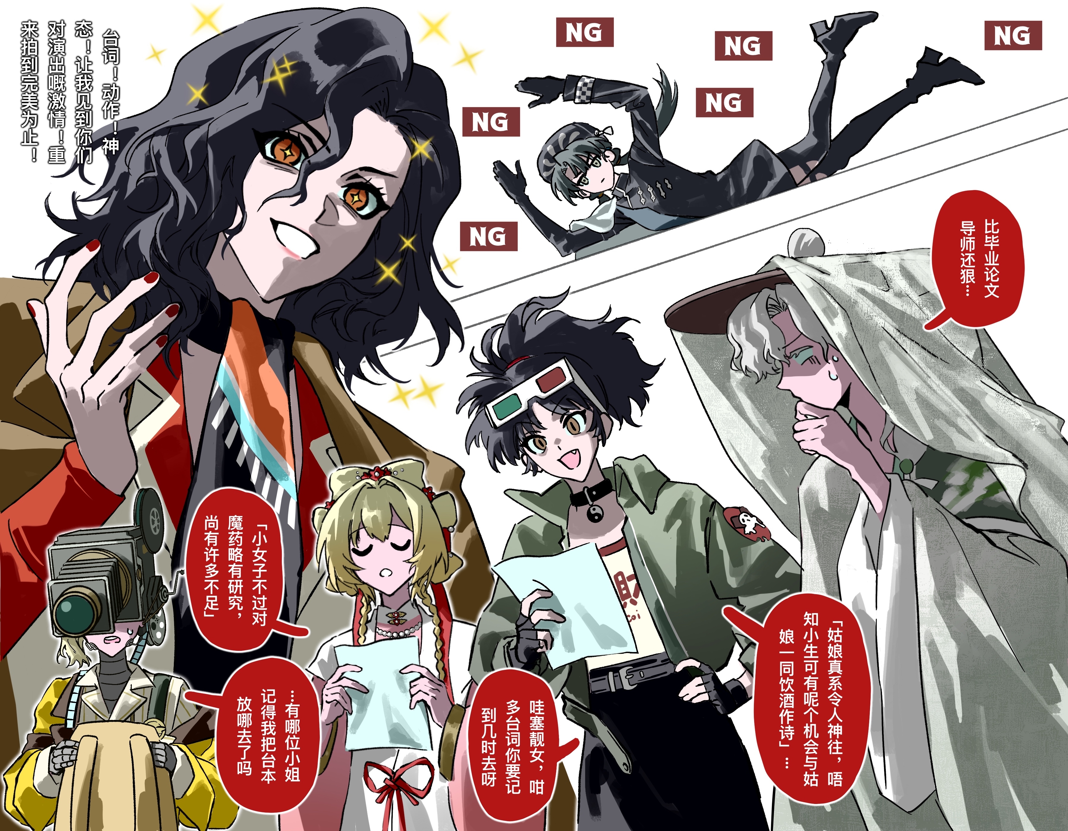 +_+ 3d 6+girls :d absurdres an-an_lee backpack bag beret black_boots black_choker black_dress black_gloves black_hair black_hat black_neckerchief black_skirt blonde_hair boots brown_coat cape chinese_clothes chinese_text choker closed_eyes coat coat_on_shoulders dress eyewear_on_head fingerless_gloves gloves green_jacket grin hand_up hands_up hanfu hat highres holding holding_bag holding_paper jacket liang_yue_(reverse:1999) loggerhead_(reverse:1999) long_hair low_twintails lying medium_hair metal_skin molen106 movie_camera multiple_girls neckerchief noire_(reverse:1999) object_head official_alternate_costume on_side open_mouth orange_eyes paper pink_hanfu ponytail red_shirt reverse:1999 shirt short_dress shuangyaji side_ponytail skirt smile sotheby sotheby_(the_red_thread_of_fate) sparkle speech_bubble sweat thigh_boots translation_request twintails upper_body vest weimao white_background white_cape white_hair white_hanfu white_vest windsong_(records_from_the_jade_hunt)_(reverse:1999) windsong_(reverse:1999) yellow_coat yellow_eyes yin_yang