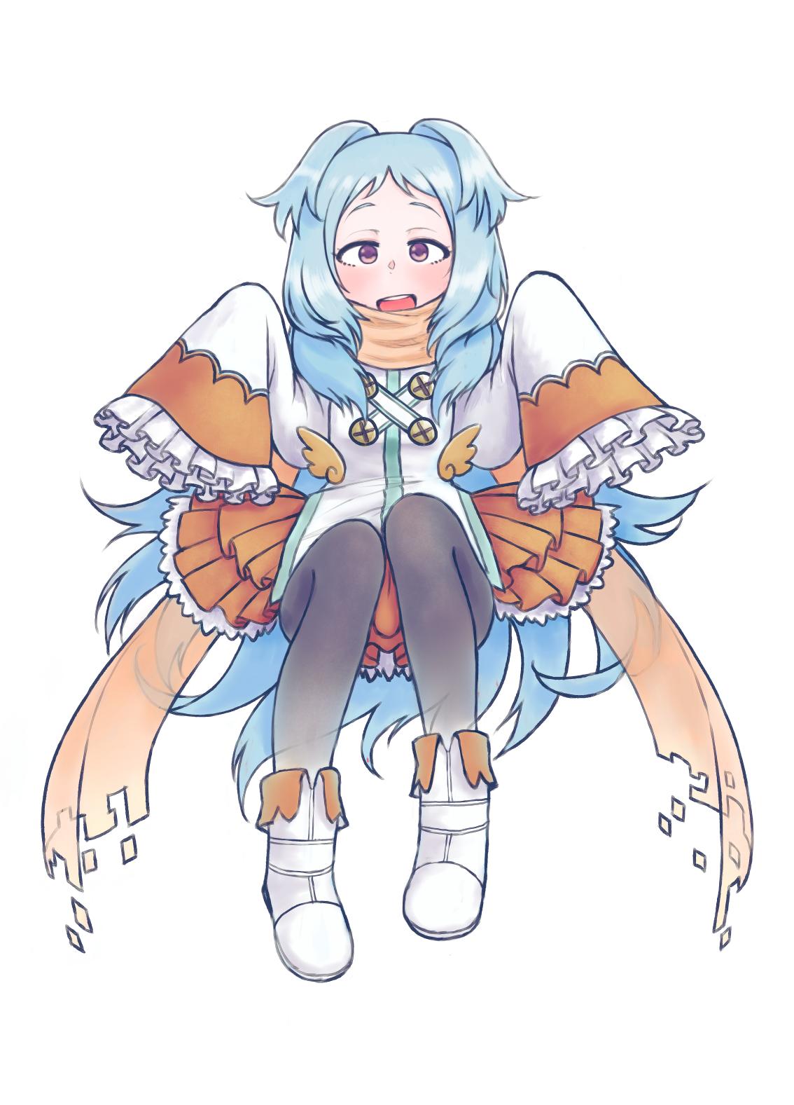 1girl black_pantyhose blue_hair boots commentary_request full_body highres jacket layered_skirt long_hair miyako_(princess_connect!) open_mouth orange_scarf orange_skirt pantyhose pleated_skirt princess_connect! purple_eyes scarf skirt sleeves_past_fingers sleeves_past_wrists solo takeomi_(shitamatsuge) two_side_up very_long_hair white_boots white_jacket