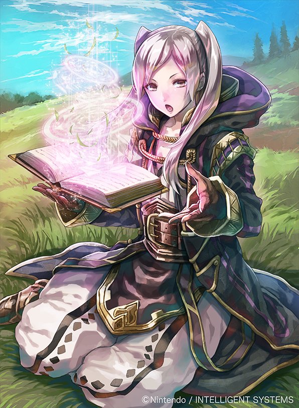 1girl belt bisaiiiii black_robe blue_sky book boots cloud commentary_request day female_robin_(fire_emblem) fire_emblem fire_emblem_awakening fire_emblem_cipher gloves hood hooded_robe knee_boots long_hair long_sleeves looking_at_viewer magic nintendo official_art open_clothes open_mouth open_robe outdoors pants robe sitting sky sleeves_past_wrists solo tongue twintails white_hair white_pants wizard