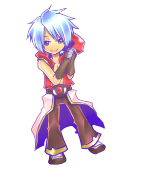1boy akanegusa blue_eyes blue_hair brown_gloves brown_pants brown_shoes champion_(ragnarok_online) closed_mouth coat commentary_request full_body gloves hood hooded_coat looking_at_viewer lowres male_focus multicolored_coat pants ragnarok_online red_coat shoes short_hair simple_background sleeveless sleeveless_coat smile solo two-tone_coat white_background white_coat