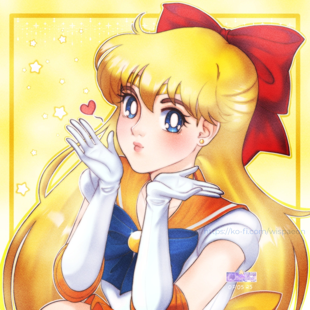 1girl aino_minako bishoujo_senshi_sailor_moon blonde_hair blowing_kiss blush bow cropped earrings gloves heart jewelry long_hair looking_at_viewer magical_girl red_bow sailor_venus short_sleeves upper_body very_long_hair wispaeon