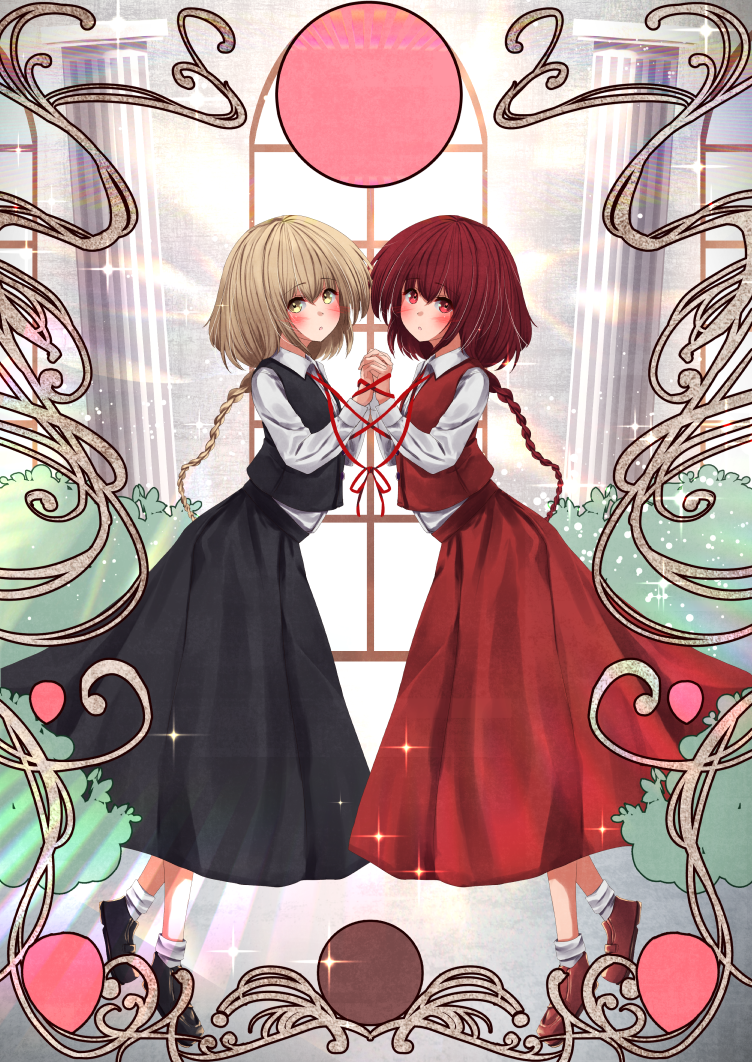 alternate_color black_shoes black_skirt black_vest blonde_hair blush bound bound_wrists braid dress long_braid long_hair long_sleeves looking_at_viewer okazaki_yumemi okazaki_yumemi_(alternate) player_2 red_eyes red_hair red_vest shirt shoes skirt teruteru12 touhou touhou_(pc-98) vest window yellow_eyes