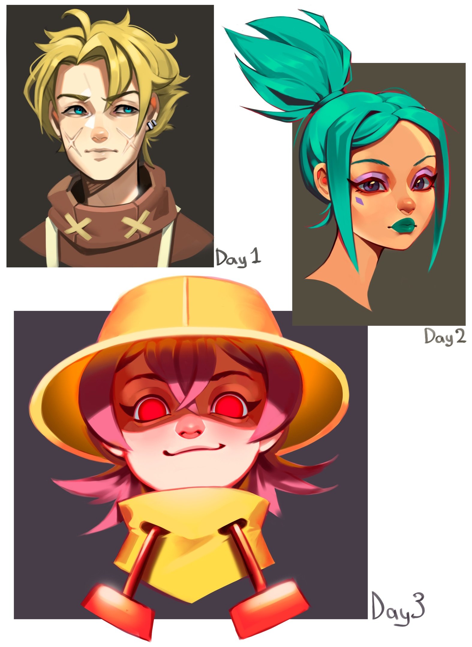 1boy 2girls blonde_hair blue_eyes border cerebella_(skullgirls) drawstring ear_piercing eyeshadow glowing glowing_eyes green_hair green_lips grey_background hat highres leduc_(skullgirls) lipstick looking_at_viewer looking_to_the_side luxey_san makeup multiple_girls piercing pink_hair ponytail portrait purple_eyes raincoat red_eyes scar scar_on_face skullgirls smile umbrella_(skullgirls) white_border