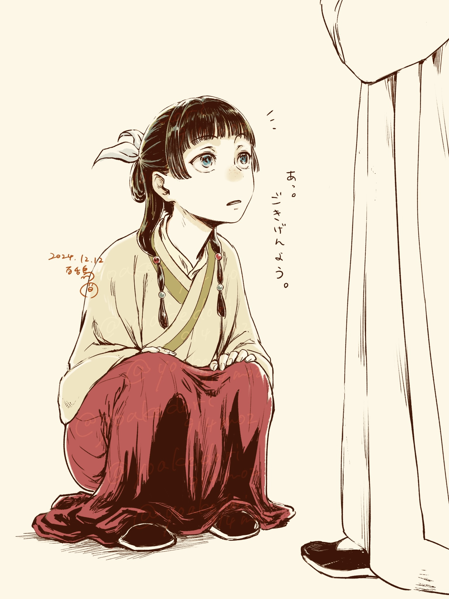 1girl black_shoes blue_eyes chinese_clothes dated freckles hanfu highres kusuriya_no_hitorigoto looking_at_another maomao_(kusuriya_no_hitorigoto) medium_hair shoes simple_background solo squatting watermark yoakedori914moz