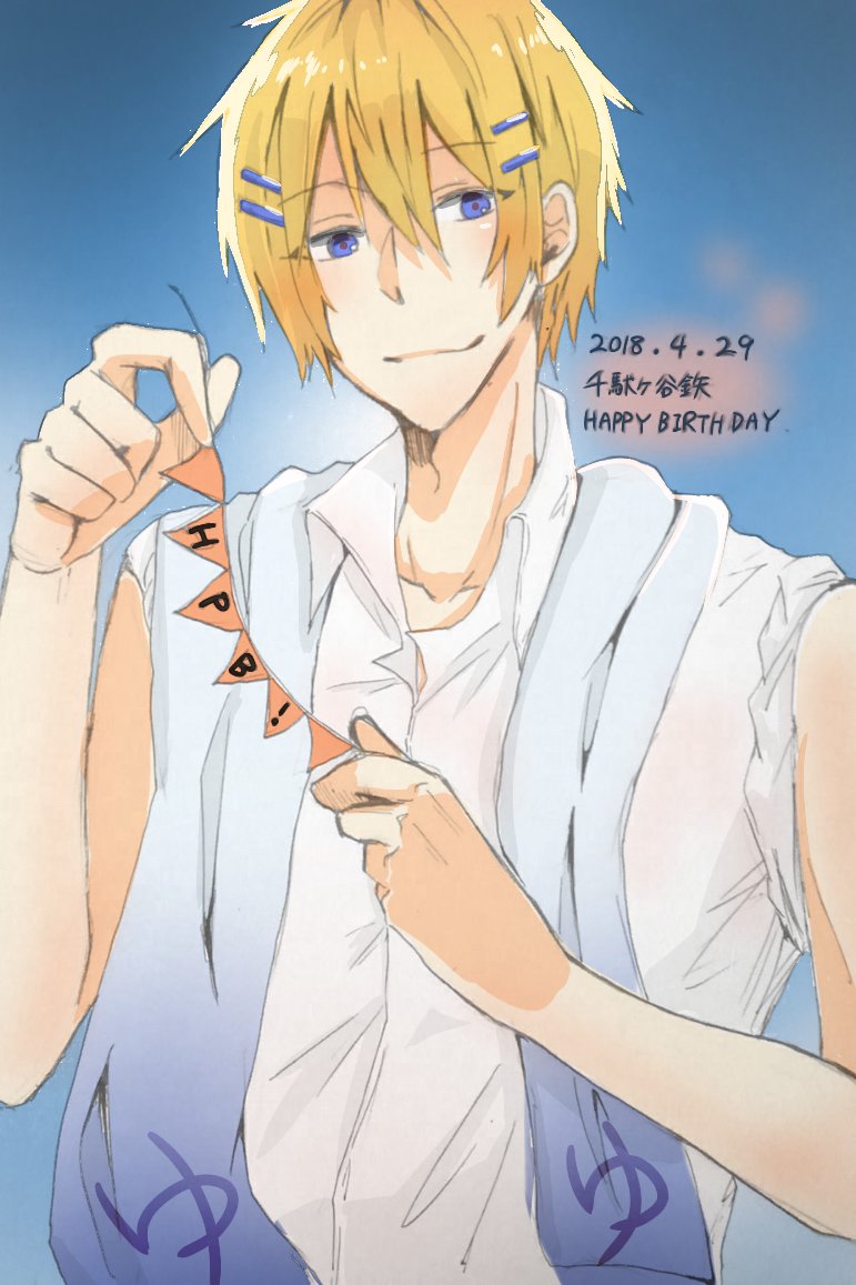 1boy blonde_hair blue_background blue_eyes hair_ornament happy_birthday kononn0804 male_focus sendagaya_tetsu servamp short_hair sleeveless toned toned_male towel towel_around_neck