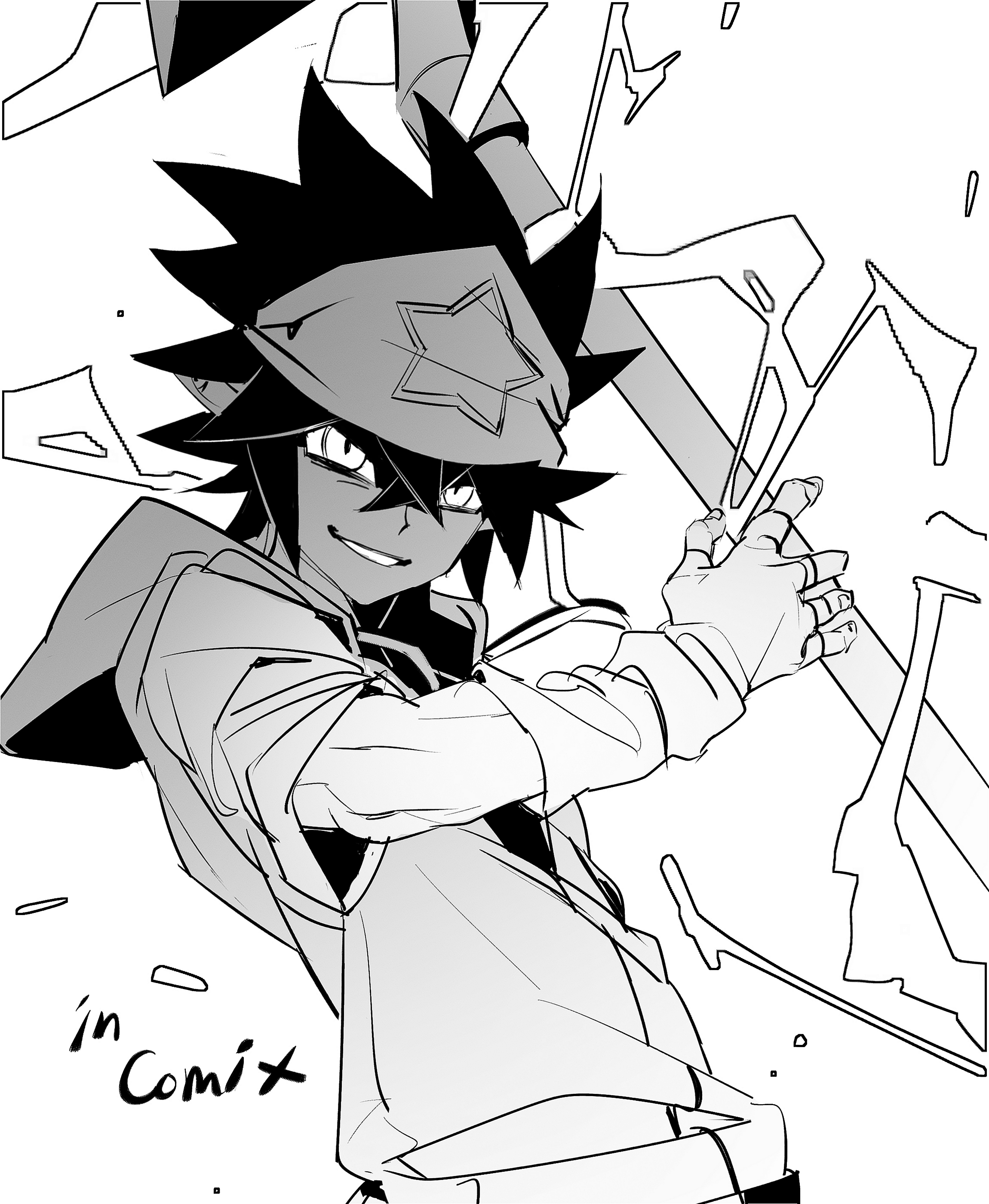 1boy absurdres ah_211 aotu_world bandana chinese_commentary electricity english_text fingerless_gloves gloves greyscale grin hair_between_eyes headband highres holding holding_weapon hood hood_down hooded_jacket jacket looking_at_viewer male_focus monochrome ray_(aotu_world) shirt simple_background smile solo spiked_hair star_(symbol) star_print upper_body weapon white_background