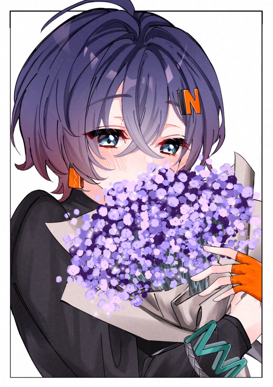 1girl belle_(zenless_zone_zero) black_shirt blue_hair blush bouquet fingerless_gloves flower gloves green_eyes hair_between_eyes highres holding holding_bouquet mokomokololo orange_gloves purple_flower shirt short_hair upper_body zenless_zone_zero