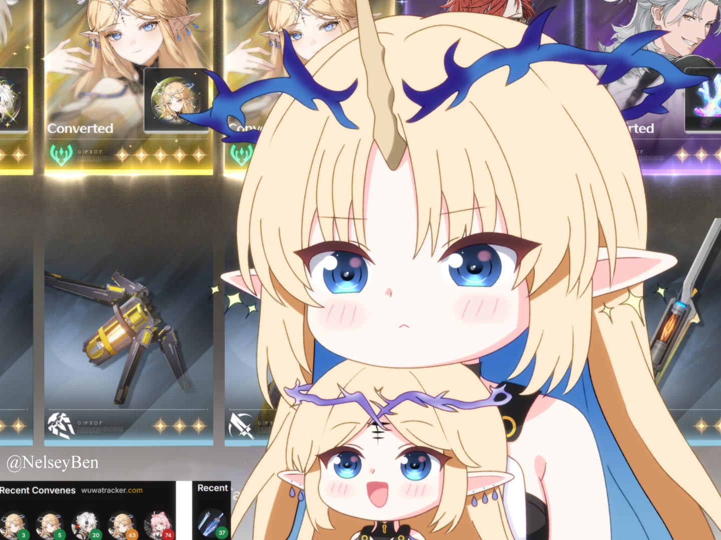 2girls blonde_hair blue_eyes blue_hair bnelsey cartethyia_(wuthering_waves) chin_rest closed_mouth colored_inner_hair commentary dual_persona earrings english_commentary fleurdelys_(wuthering_waves) floating_earrings game_screenshot_background head_on_head head_rest horns jewelry long_hair multicolored_hair multiple_girls open_mouth parted_bangs pointy_ears screenshot_background sidelocks single_horn smile twitter_username very_long_hair wuthering_waves yellow_horns