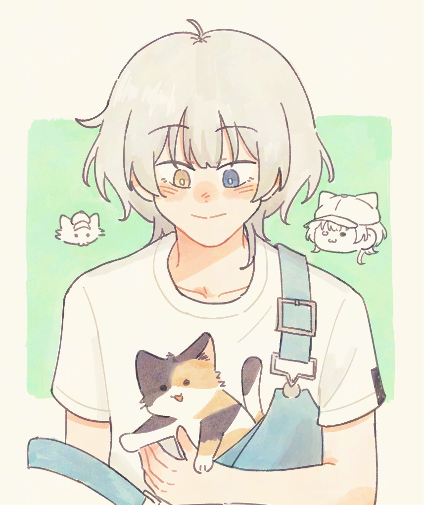 1girl bang_dream! bang_dream!_it's_mygo!!!!! blue_eyes calico_(pattern) calico_cat commentary_request gampong44 green_background heterochromia kaname_raana medium_hair overalls raana_the_cat shirt short_sleeves smile solo thai_commentary two-tone_background upper_body white_hair white_shirt wolf_cut yellow_background yellow_eyes