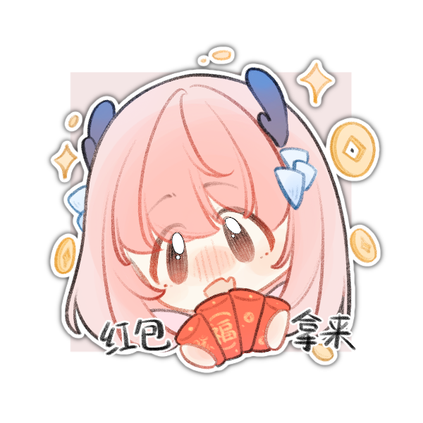 1girl blue_horns blush brown_eyes chibi chinese_commentary chinese_new_year chinese_text coin commentary_request cropped_torso dragon_horns envelope eyes_visible_through_hair fang hair_ornament happy head_tilt holding holding_envelope holed_coin hongbao horns huizi light_blush long_hair looking_at_viewer loose_hair_strand nikki_(nikki) nikki_(series) open_mouth outline pink_background pink_hair pink_shawl second-party_source shawl skin_fang small_horns smile solo sparkle straight_hair tareme translation_request two-tone_background white_background white_outline
