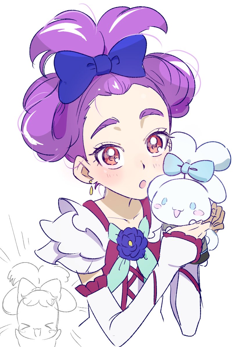 1girl :o arm_warmers blue_flower blue_rose bow brooch cinnamiku_hairstyle cinnamoroll earrings flower fuwa_fuwa_cinnamoroll hair_bow hair_up holding jewelry kei_(wa_shoi) light_blush looking_at_viewer milky_rose open_mouth precure purple_hair red_eyes rose sanrio thick_eyebrows tied_ears updo white_arm_warmers yes!_precure_5 yes!_precure_5_gogo!