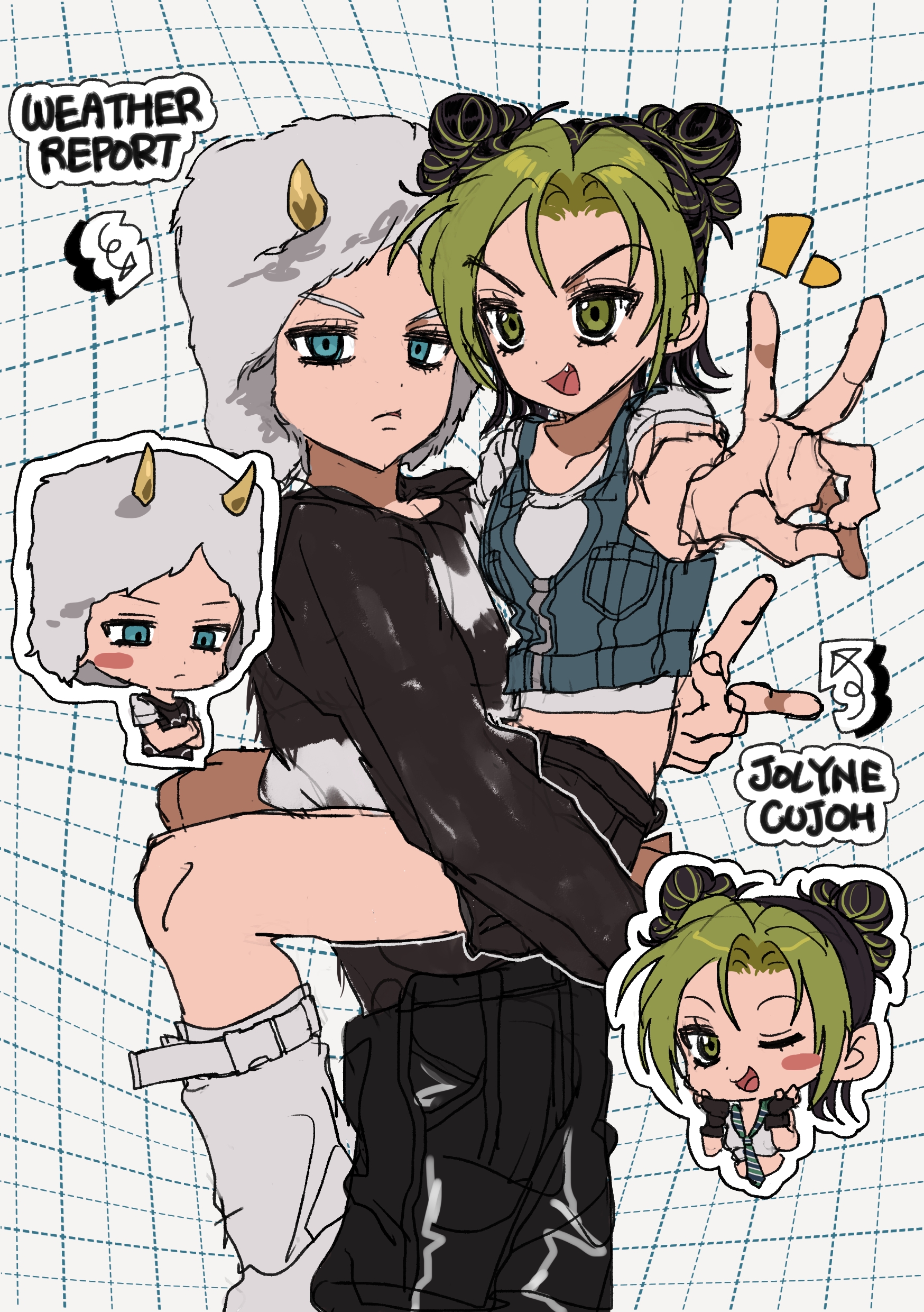 1boy 1girl :d absurdres aqua_eyes arrow_(symbol) black_hair black_pants black_shorts brown_shirt character_name chibi chibi_inset crop_top cropped_shirt cropped_vest denim_vest double_bun fake_horns fang fu_r_y fur_hat green_eyes green_hair grid_background hair_bun hat highres horned_hat horned_headwear horns jojo_no_kimyou_na_bouken kuujou_jolyne lifting_person multicolored_hair open_mouth outline pants shirt shoes shorts smile stone_ocean two-tone_hair v vest weather_report white_outline white_shirt white_shoes