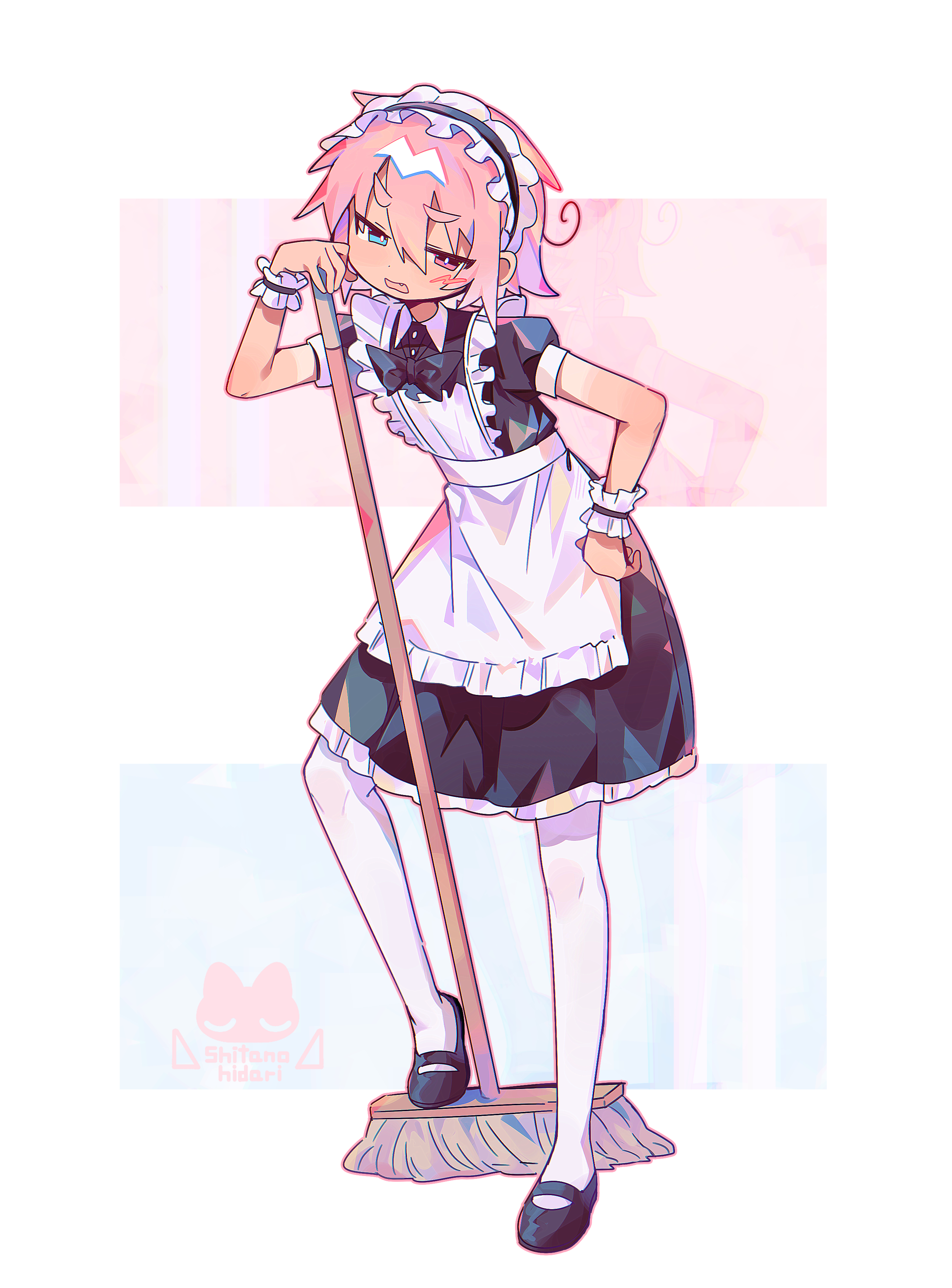 1boy absurdres apron artist_logo black_bow black_bowtie black_dress black_shoes blue_eyes blush_stickers bow bowtie bright_pupils collared_dress commentary_request crossdressing crossdressing_(mtf) dress fang frilled_apron frilled_wrist_cuffs frills full_body heterochromia highres holding holding_mop logo maid maid_apron male_focus male_maid mary_janes mop open_mouth original pantyhose petticoat pink_eyes pink_hair puffy_short_sleeves puffy_sleeves raito-kun_(uenomigi) shoes short_hair short_sleeves single_blush_sticker solo tan tanline trap uenomigi white_apron white_pantyhose white_pupils wrist_cuffs