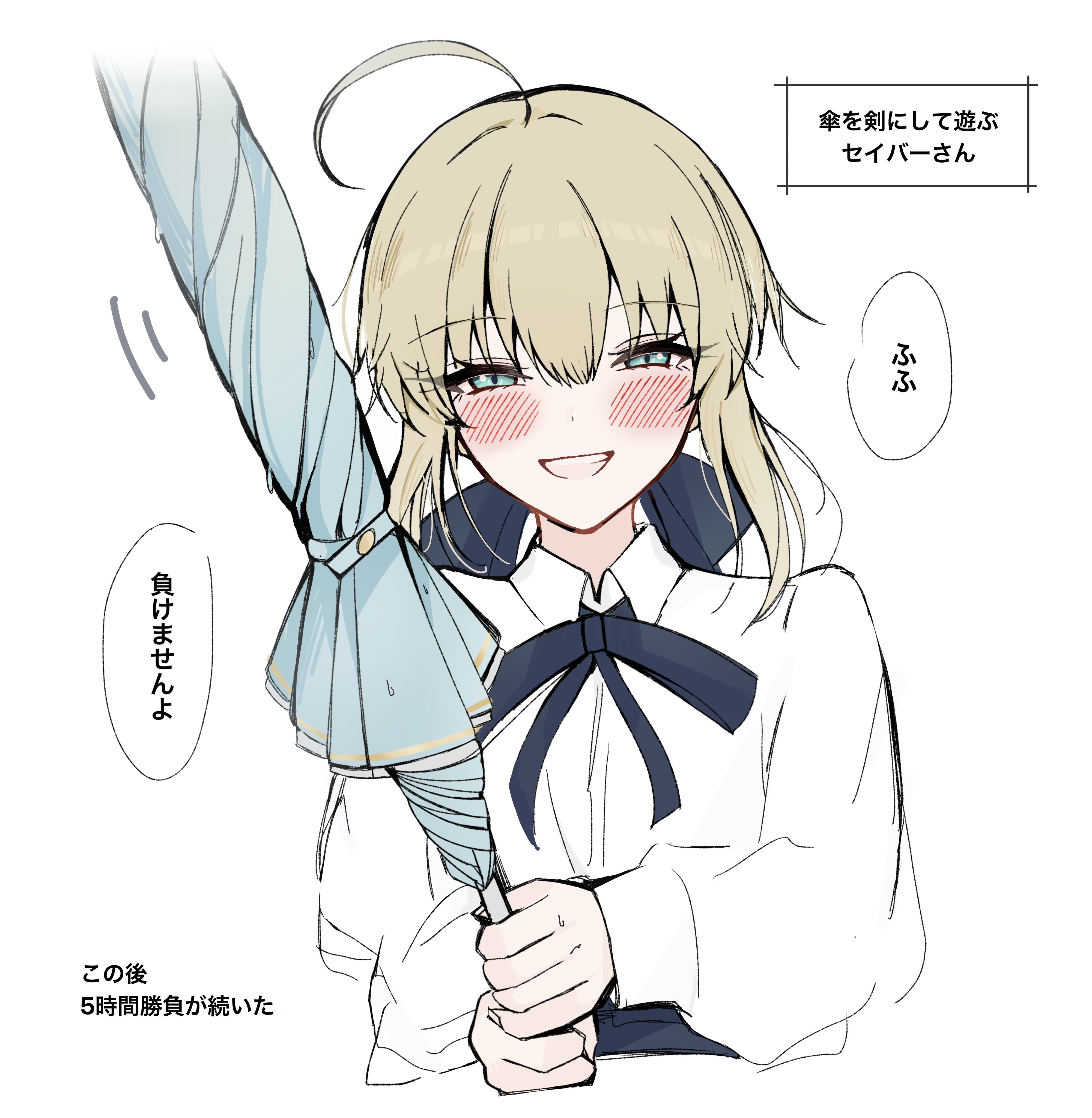 1girl absurdres ahoge artoria_pendragon_(fate) blonde_hair blue_ribbon blush commentary_request fate/stay_night fate_(series) grey_hair hair_ribbon hayato_hoshi604 highres holding holding_umbrella long_sleeves looking_at_viewer neck_ribbon open_mouth ribbon saber_(fate) shirt simple_background solo translation_request umbrella white_shirt