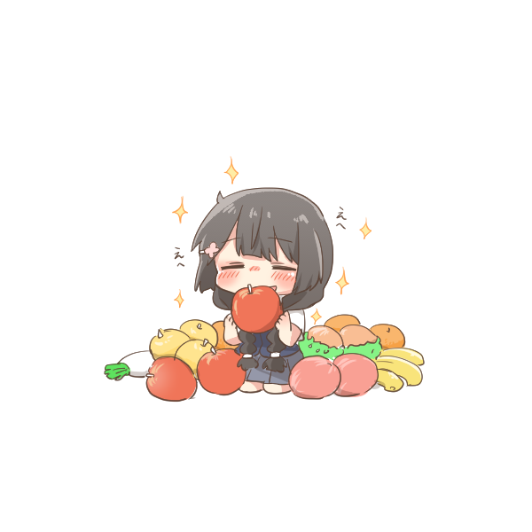 1girl :d apple banana black_hair blush_stickers braid chibi closed_eyes facing_viewer food food_request fruit grey_skirt hair_ornament hair_over_shoulder hairclip holding holding_food kneeling low_twintails nijisanji open_mouth pleated_skirt rebecca_(keinelove) school_uniform shirt short_sleeves simple_background skirt smile solo sparkle sweater_vest translation_request tsukino_mito tsukino_mito_(summer_uniform) twin_braids twintails virtual_youtuber white_background white_shirt