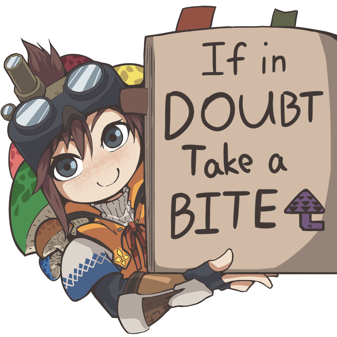 1girl black_gloves book brown_hair fingerless_gloves folded_ponytail gloves goggles goggles_on_head handler_(monster_hunter_world) holding holding_book looking_at_viewer monster_hunter:_world monster_hunter_(series) mushroom popped_collar smile tflame