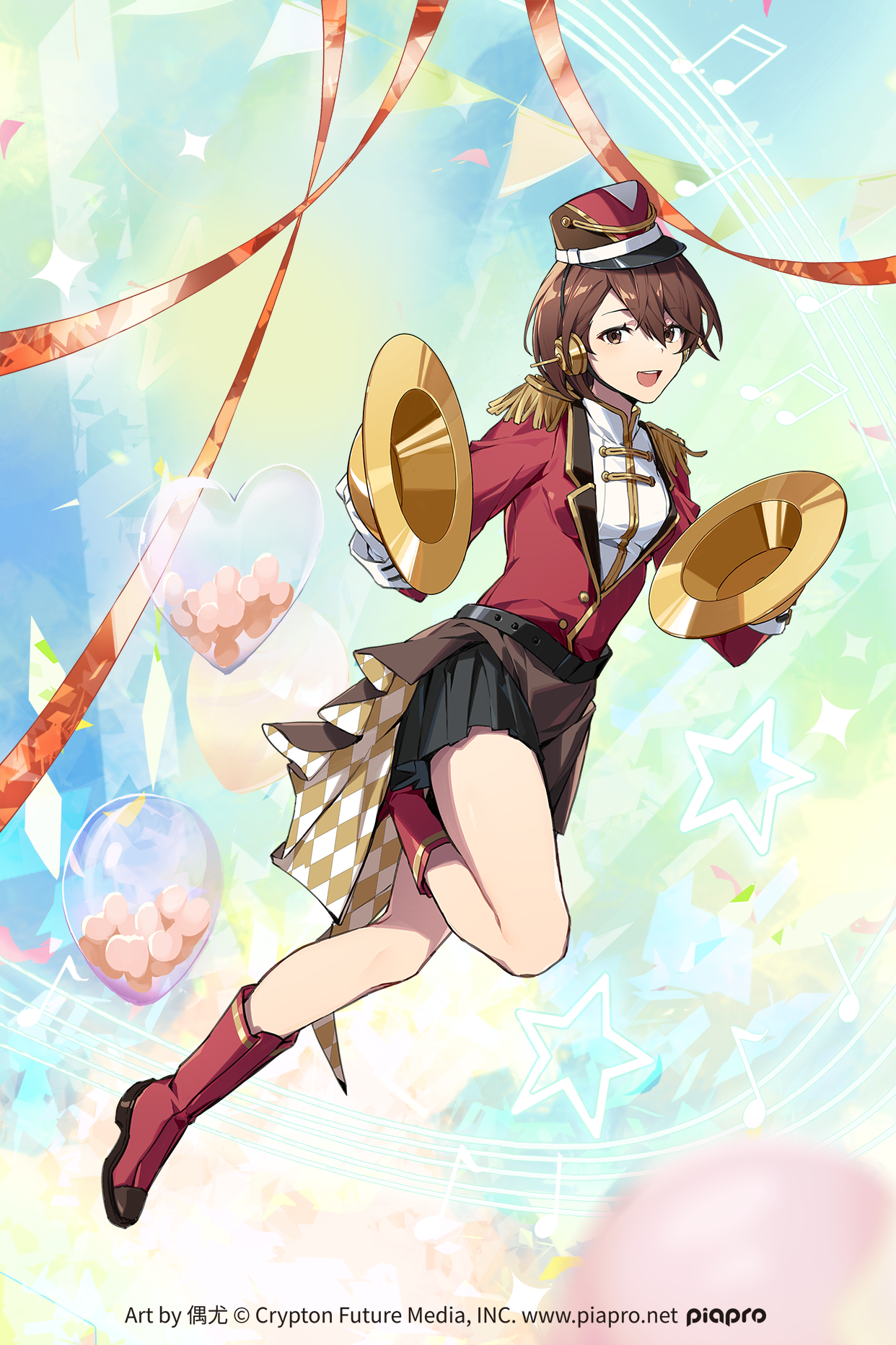 1girl :d artist_name bad_source belt black_skirt boots brown_eyes brown_hair character_name copyright_name cymbals full_body gloves hair_between_eyes hat headphones highres holding instrument jacket long_bangs long_sleeves looking_at_viewer meiko_(vocaloid) miniskirt official_art open_mouth oyo_hitsuji pleated_skirt ribbon sidelocks skirt smile solo standing teeth upper_teeth_only vocaloid watermark