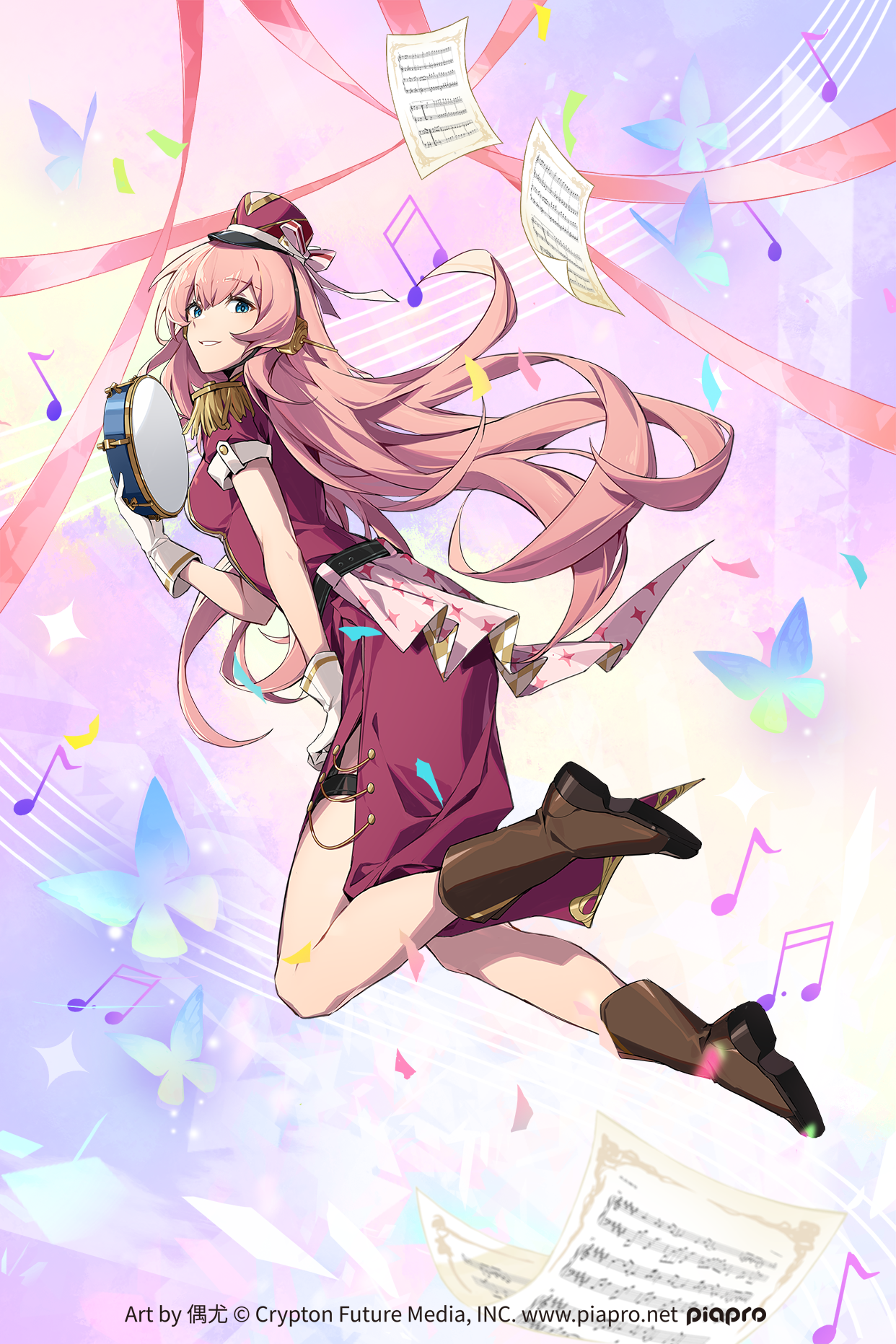 1girl artist_name bad_source blue_eyes boots breasts bug butterfly character_name copyright_name dress drum floating_hair full_body gloves hair_between_eyes hand_on_own_thigh hat headphones highres holding insect instrument long_bangs long_hair looking_at_viewer megurine_luka musical_note official_art oyo_hitsuji pink_hair short_sleeves sidelocks solo star_(symbol) thigh_strap vocaloid watermark white_gloves