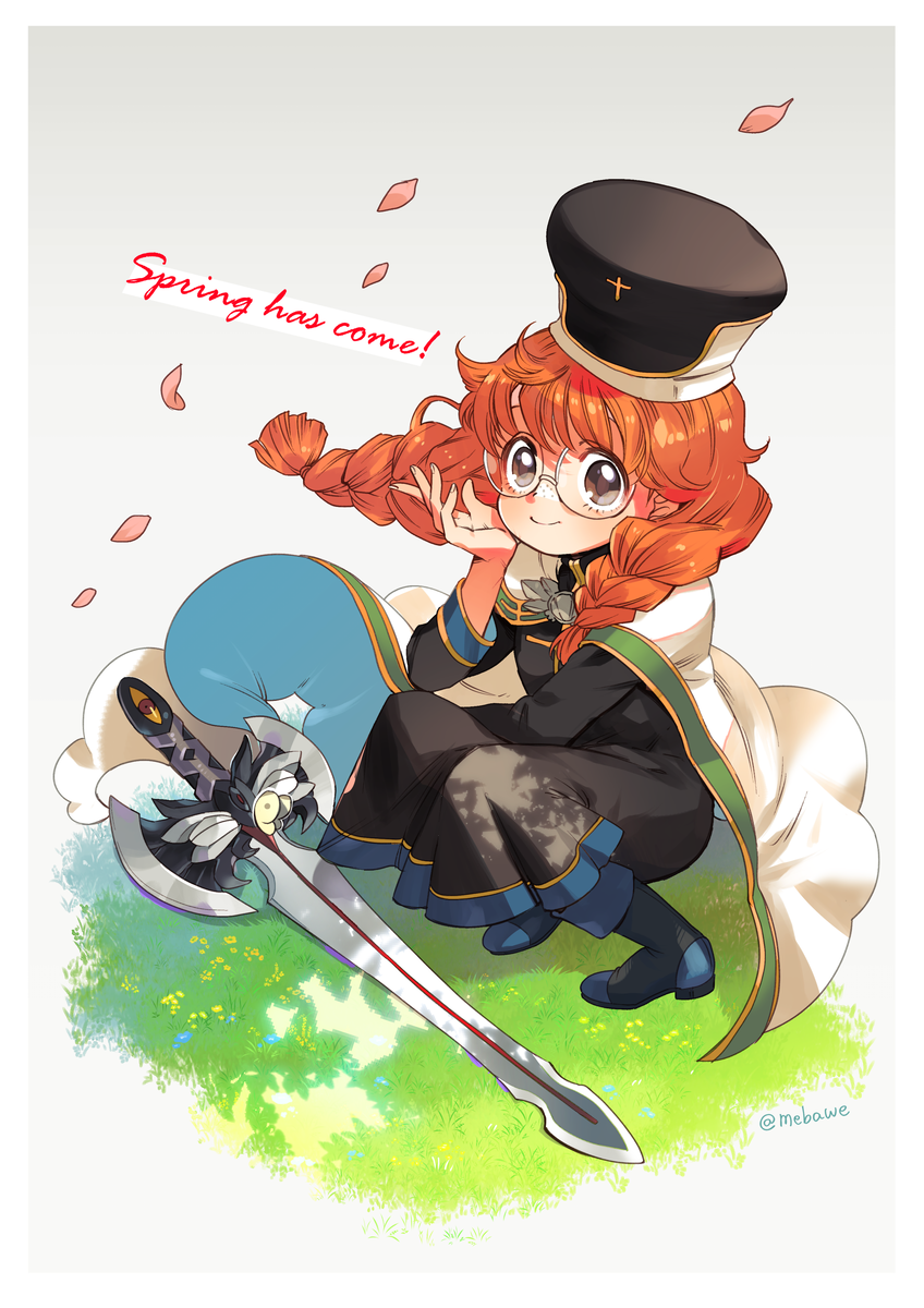 1girl black_dress black_hat blue_background blue_boots blush boots border braid brown_eyes cafe_artful cape closed_mouth commentary dress english_text full_body glasses hat hayasaka_mebawe highres long_hair long_sleeves looking_at_viewer orange_hair rance_(series) round_eyewear smile solo squatting sword twin_braids weapon white_border white_cape