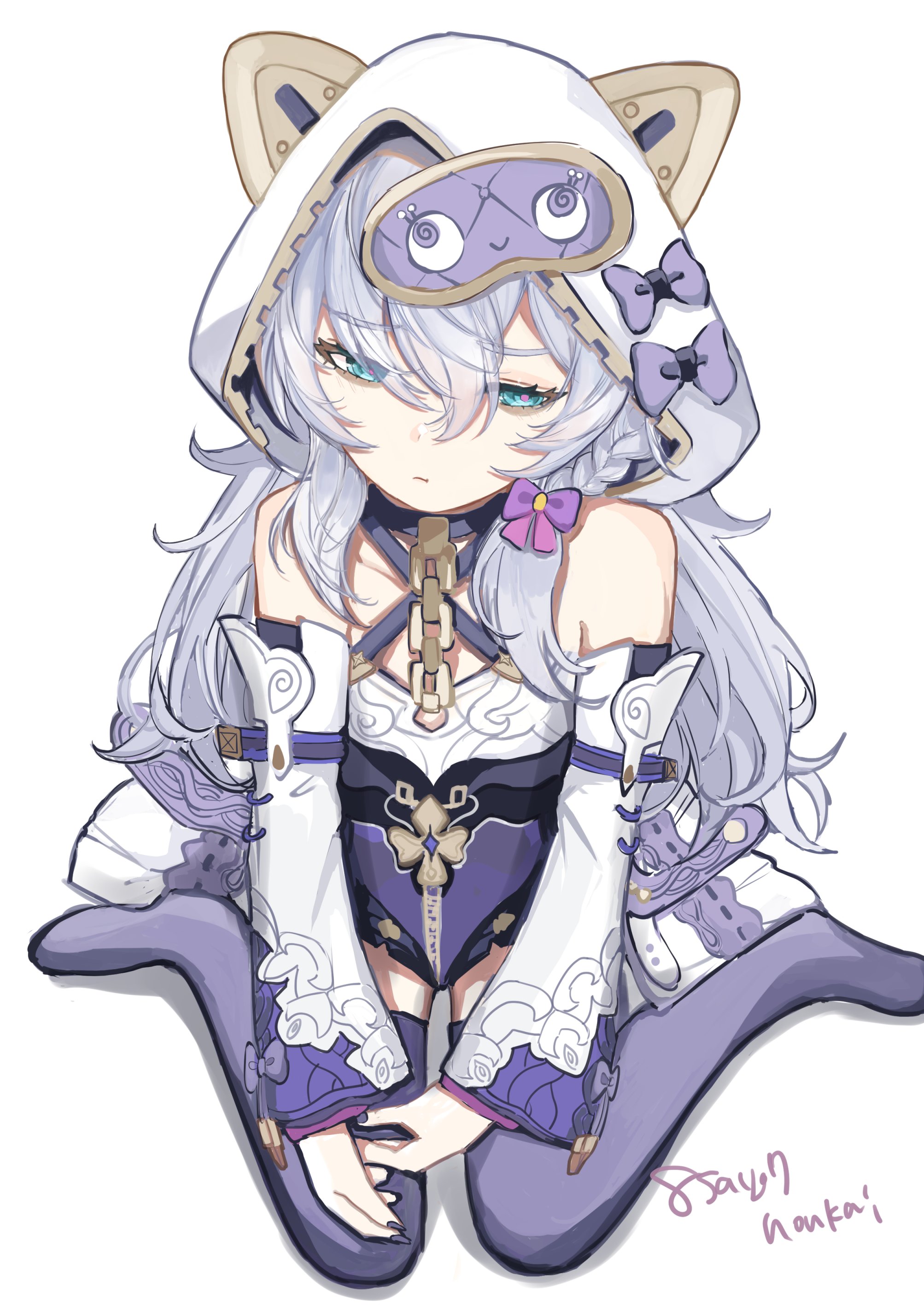 1girl 8sayo7_(8sayo7honkai) absurdres bare_shoulders blue_eyes bow closed_eyes closed_mouth detached_sleeves dress full_body highres honkai_(series) honkai_impact_3rd jacket long_hair looking_at_viewer meme purple_bow purple_thighhighs simple_background sitting sleep_mask solo teri_derp_(meme) theresa_apocalypse theresa_apocalypse_(schicksal's_imperative) thighhighs wariza white_background white_dress white_hair white_jacket white_sleeves