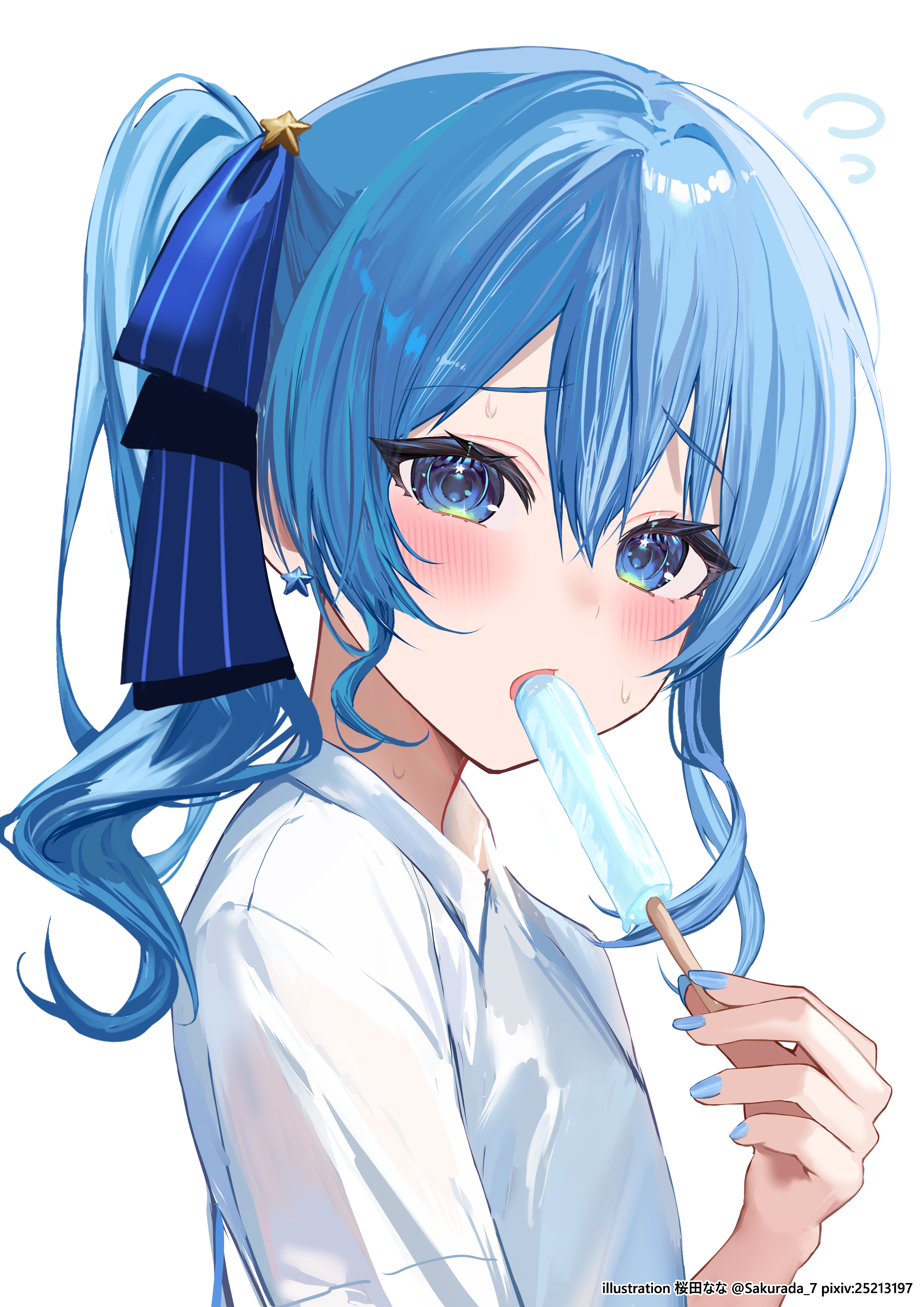 1girl :o absurdres blue_eyes blue_hair blue_nails blue_ribbon blush earrings eating food hair_ribbon high_side_ponytail highres holding holding_food holding_popsicle hololive hoshimachi_suisei hot jewelry long_hair looking_at_viewer popsicle ribbon sakurada_nana shirt side_ponytail simple_background solo star_(symbol) star_earrings star_in_eye sweat symbol_in_eye upper_body virtual_youtuber white_background white_shirt