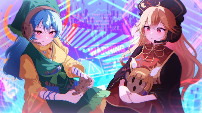 2girls abstract_background apron arm_ribbon belt black_belt black_dress black_hat black_nails blonde_hair blue_hair blue_nails blush bow breasts chinese_clothes closed_mouth commentary commission controller crescent crescent_print dalachi_(headdress) double_bun dress english_commentary flower frills green_apron green_bow green_headscarf hair_between_eyes hair_bun hair_ribbon hammer haniwa_(statue) haniyasushin_keiki hat headphones headscarf holding holographic_interface jewelry joutouguu_mayumi joystick junko_(touhou) long_hair long_sleeves looking_at_another looking_at_viewer magatama magatama_necklace mandarin_collar medium_breasts microphone multicolored_nails multiple_girls nail_polish neck_ribbon necklace open_mouth orange_hair phoenix_print pocket puffy_short_sleeves puffy_sleeves red_eyes red_nails red_tabard ribbon rinkaito1231 short_hair short_sleeves sitting skeb_commission smile tabard tongue tongue_out touhou turtleneck turtleneck_dress white_flower white_ribbon wide_sleeves wood_carving_tool yellow_dress yellow_ribbon