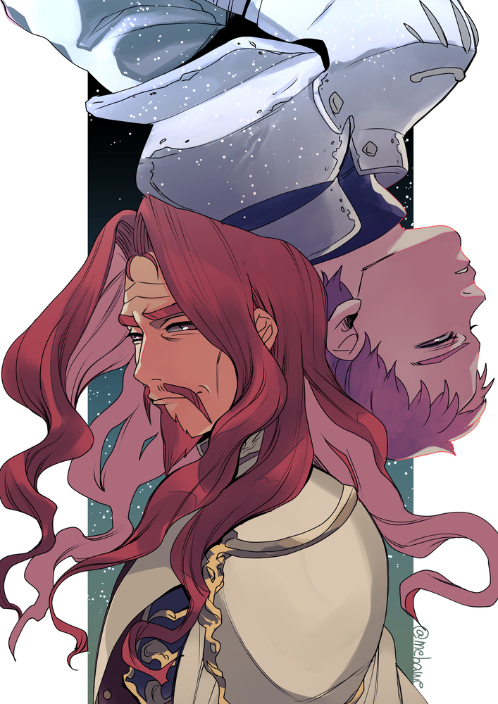 2boys age_comparison armor beard british_(rance) commentary_request dual_persona facial_hair hayasaka_mebawe long_hair male_focus multiple_boys mustache rance_(series) red_hair rotational_symmetry smile upper_body