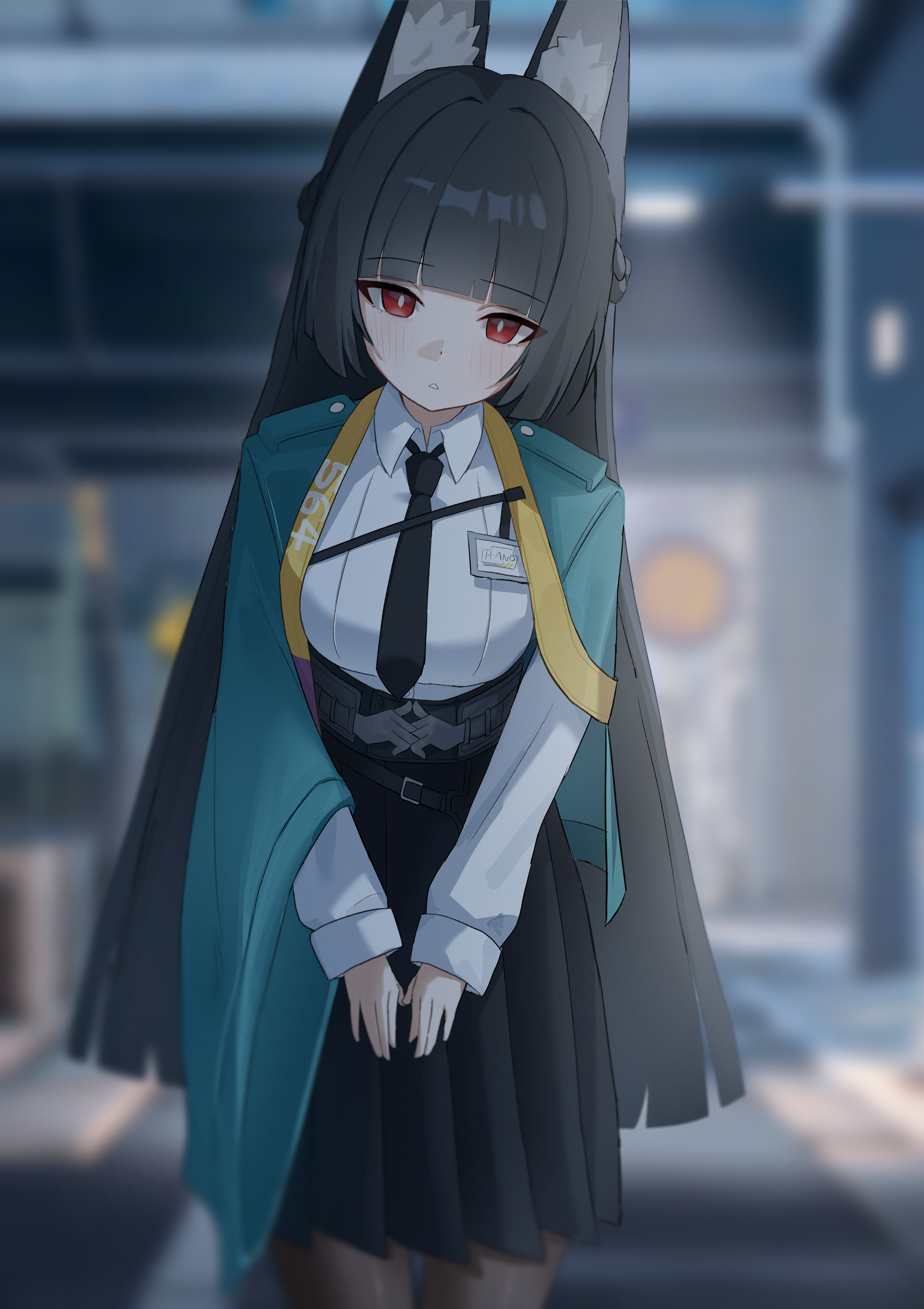 1girl absurdres animal_ear_fluff animal_ears aqua_jacket black_necktie black_pantyhose black_skirt blunt_bangs collared_shirt cowboy_shot fox_ears fox_girl high-waist_skirt highres hoduttang hoshimi_miyabi jacket necktie open_clothes open_jacket outdoors pantyhose red_eyes shirt skirt white_shirt zenless_zone_zero