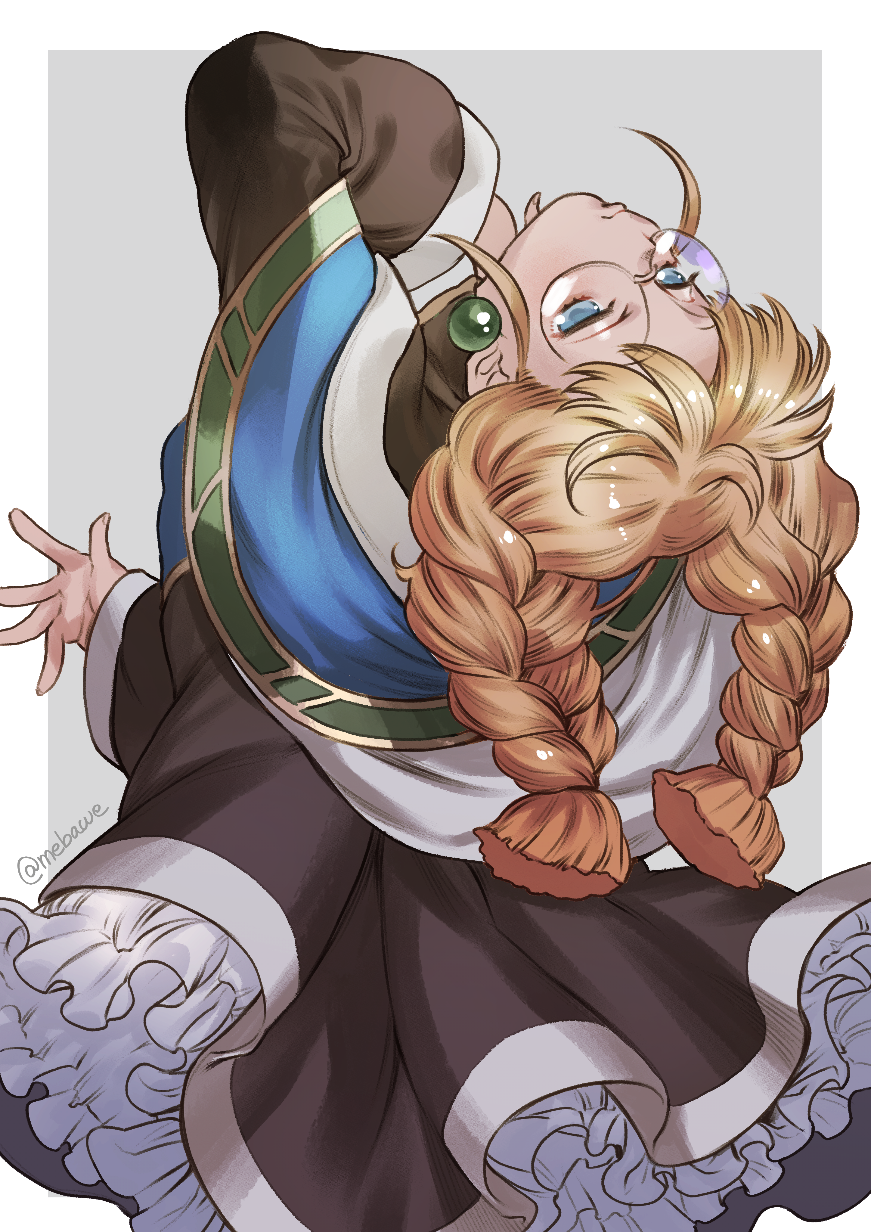 1girl absurdres artist_name black_dress blue_cape blunt_ends border braid braided_twintails cafe_artful cape closed_mouth commentary_request dress earrings feet_out_of_frame glasses grey_background hayasaka_mebawe head_back highres jewelry long_dress long_hair long_sleeves multicolored_cape no_pupils orange_hair parted_bangs pearl_earrings petticoat rance_(series) round_eyewear simple_background solo white_border white_cape