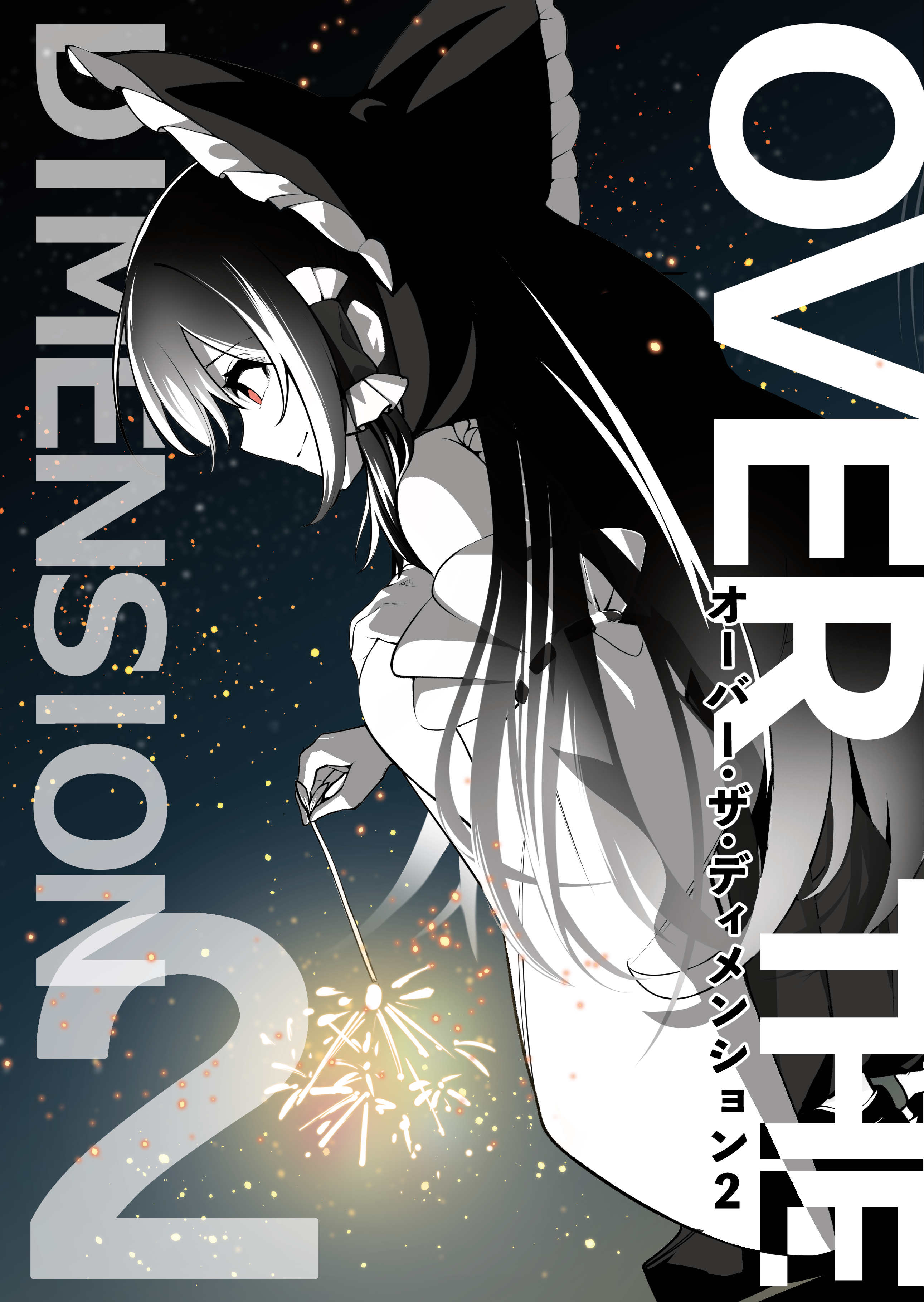 1girl absurdres akaneirotown bow closed_mouth commentary_request cover cover_page detached_sleeves fireworks frilled_bow frilled_hair_tubes frills hair_bow hair_tubes hakurei_reimu highres holding holding_fireworks long_hair nodoguro_(phi-tan) novel_cover red_eyes second-party_source smile solo sparkler squatting touhou translation_request