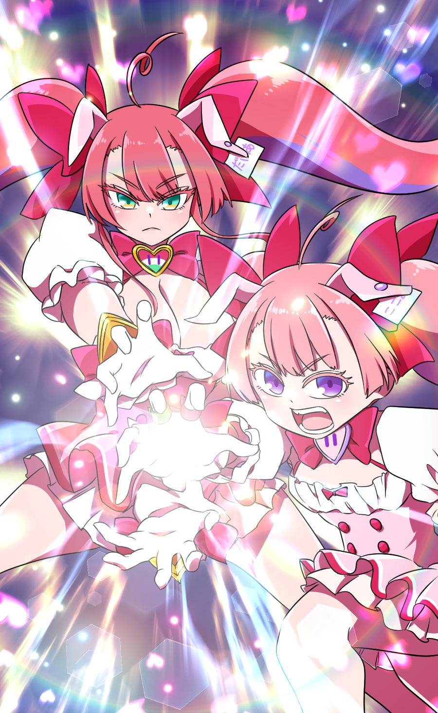 2girls bow dragon_ball dress father-son_kamehameha green_eyes highres kamehameha_(dragon_ball) magical_girl mahjong_fight_girl mature_female miniskirt mitsumoto_cocoa mitsumoto_dia mother_and_child mother_and_daughter multiple_girls parent_and_child pink_bow pink_dress pink_hair purple_eyes skirt twintails