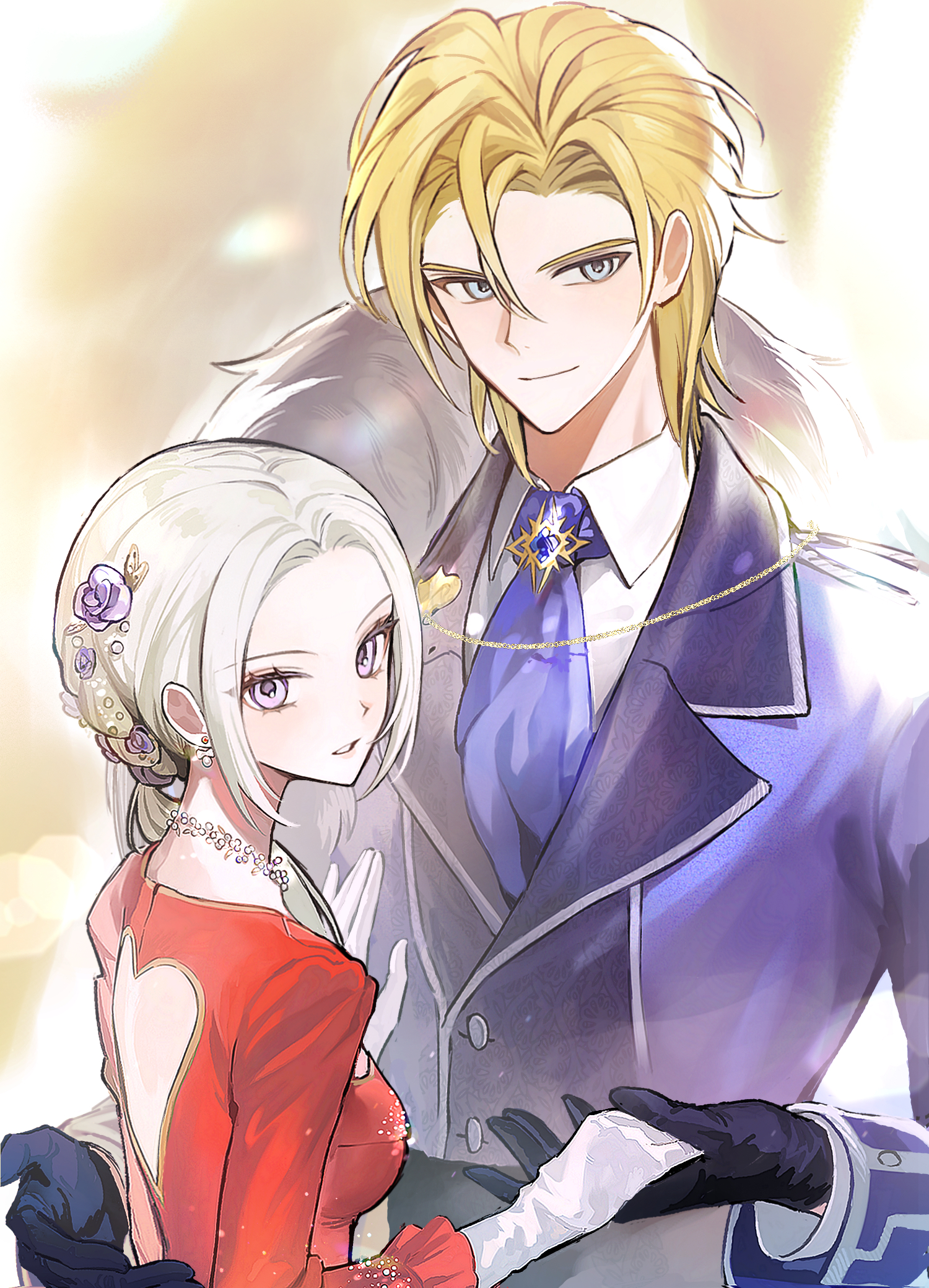 alternate_costume back_cutout blonde_hair blue_eyes blue_gloves blue_jacket blue_suit blurry blurry_background closed_mouth clothing_cutout collared_shirt commentary_request dimitri_alexandre_blaiddyd dress earrings edelgard_von_hresvelg fire_emblem fire_emblem:_three_houses fire_emblem_warriors:_three_hopes formal_clothes frilled_sleeves frills from_side fur_trim gloves hair_between_eyes hair_ornament hair_over_shoulder hair_slicked_back hand_on_another's_chest head_tilt highres holding_hands ikaikakka indoors jacket jewelry light_particles light_smile long_hair long_sleeves looking_at_viewer looking_to_the_side low_ponytail necklace nintendo parted_bangs parted_lips pendant pink_lips ponytail purple_eyes red_dress shade shirt short_hair smirk standing suit suit_jacket upper_body white_fur white_gloves white_hair white_shirt
