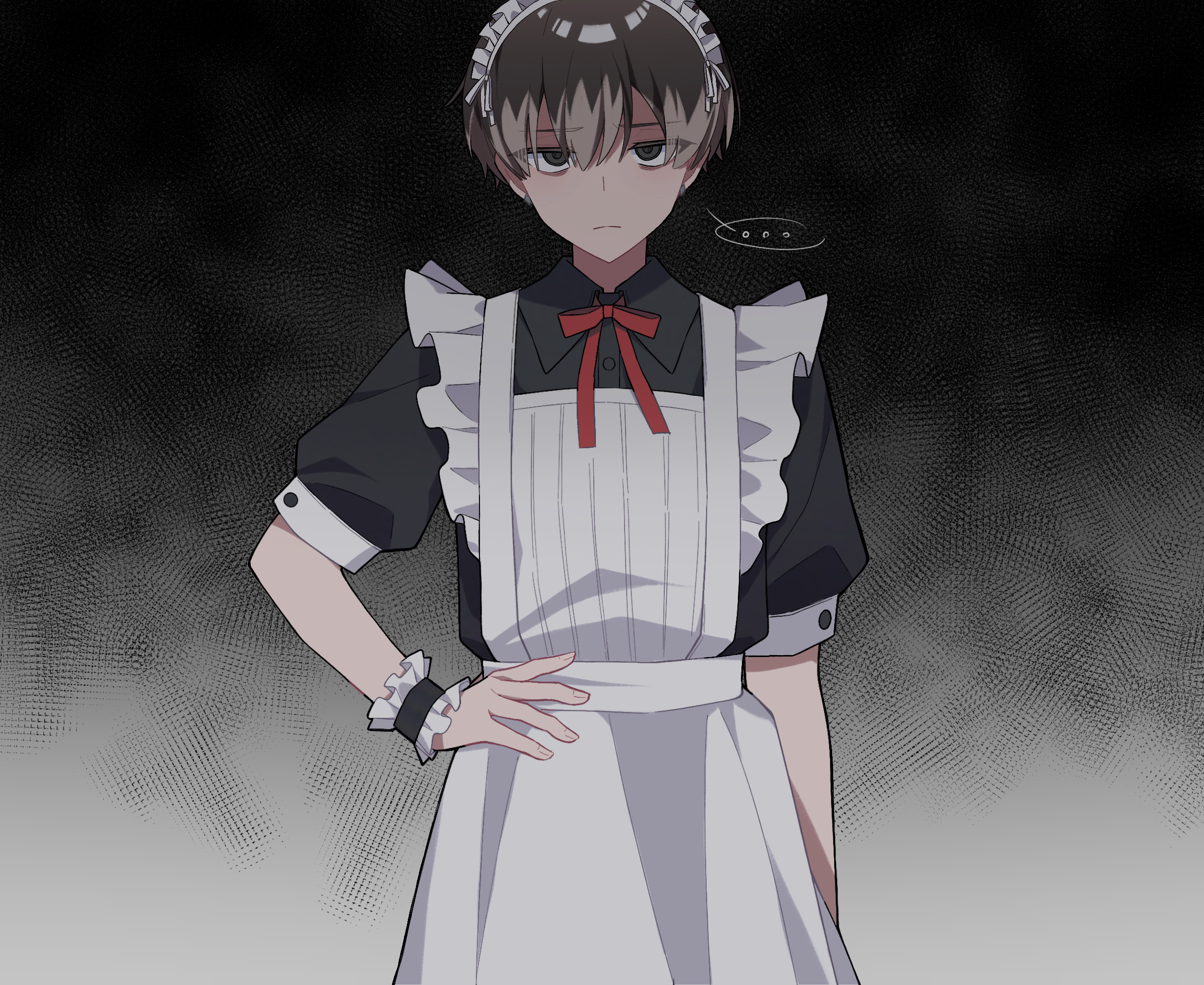 ... 1boy apron bags_under_eyes cowboy_shot crossdressing crossdressing_(mtf) frown furrowed_brow hand_on_own_hip highres kayano_mikoto looking_at_viewer maid maid_apron maid_headdress male_focus male_maid milgram neck_ribbon red_ribbon ribbon solo spoken_ellipsis yingwux1