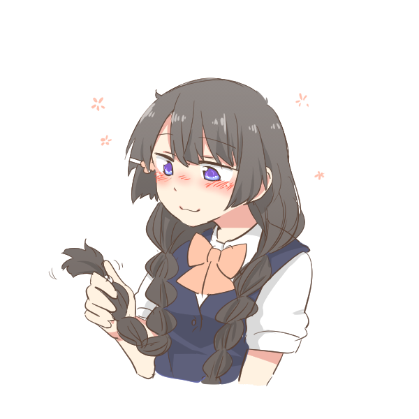 1girl black_hair blush blush_stickers bow braid cardigan_vest closed_mouth collared_shirt cropped_torso hair_over_shoulder hand_up holding holding_own_hair long_hair low_twintails nijisanji nose_blush pink_bow purple_eyes rebecca_(keinelove) shirt short_sleeves simple_background smile solo tsukino_mito tsukino_mito_(summer_uniform) twin_braids twintails upper_body very_long_hair virtual_youtuber white_background white_shirt