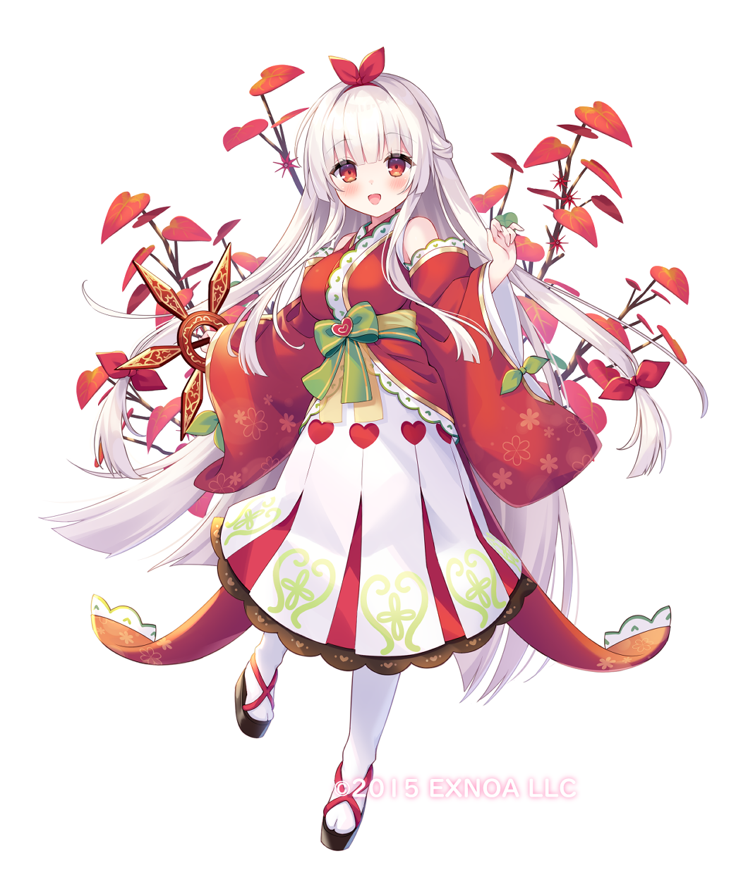 1girl :d bare_shoulders black_sandals blush bow breasts detached_sleeves flower_knight_girl green_bow hair_ribbon half_updo heart highres japanese_clothes kimono long_hair long_sleeves looking_at_viewer medium_breasts name_connection object_namesake official_art open_mouth pantyhose pleated_skirt red_eyes red_kimono red_ribbon red_sleeves redbud_hazel_(flower_knight_girl) ribbon sandals simple_background skirt sleeveless sleeveless_kimono smile solo standing standing_on_one_leg umeko_machi very_long_hair white_background white_hair white_pantyhose white_skirt wide_sleeves
