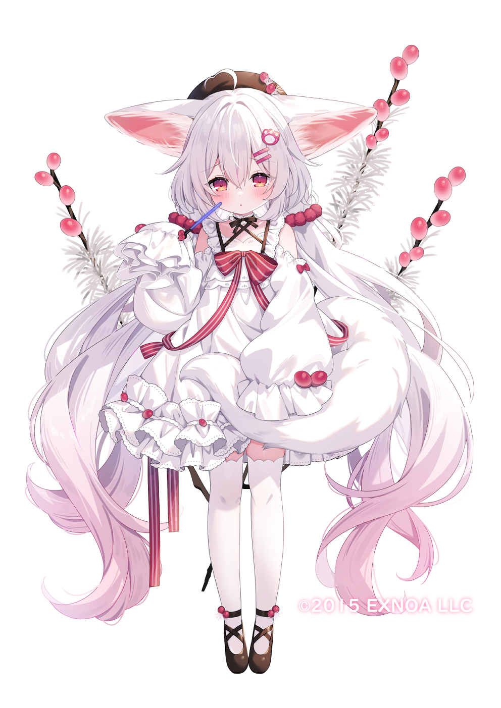 1girl ahoge animal_ear_fluff animal_ears beret black_shoes brown_hat character_request dress flower_knight_girl frilled_dress frills full_body gradient_hair hair_between_eyes hair_ornament hairclip hand_up hat heart heart_ahoge highres long_hair long_sleeves multicolored_hair name_connection object_namesake official_art pink_hair puffy_long_sleeves puffy_sleeves red_eyes shoes simple_background sleeves_past_fingers sleeves_past_wrists solo standing tail thighhighs umeko_machi very_long_hair white_background white_dress white_hair white_thighhighs