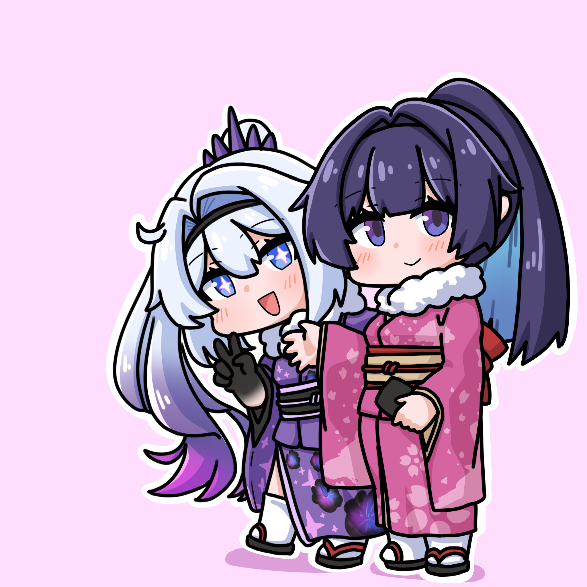+_+ 2girls :d black_gloves black_hairband black_sandals blue_eyes blue_hair blush chibi closed_mouth commentary_request floral_print gloves gradient_hair grey_hair hair_between_eyes hair_intakes hairband highres honkai_(series) honkai_impact_3rd japanese_clothes kiana_kaslana kimono long_hair long_sleeves looking_at_viewer mokkyo_(motkyo) multicolored_hair multiple_girls obi open_mouth outline pink_background pink_kimono ponytail purple_eyes purple_hair purple_kimono raiden_mei sandals sash simple_background smile socks standing tabi two-tone_hair v very_long_hair white_outline white_socks wide_sleeves zouri