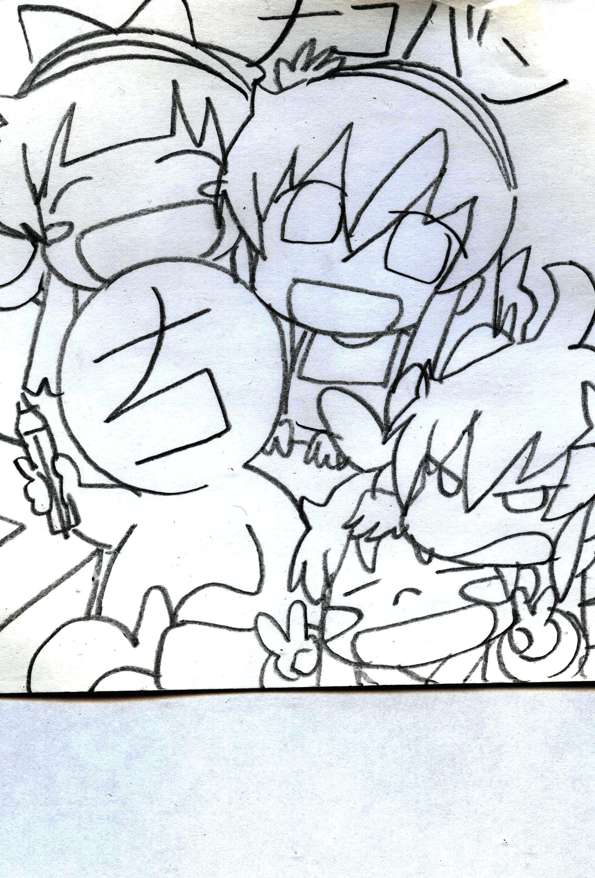 1boy 4girls absurdres ainu_clothes chibi closed_eyes double_v fingerless_gloves gloves hair_ribbon happy highres japanese_text long_hair looking_at_viewer monochrome multiple_girls nakoruru nomeno_mizuha original pencil ribbon samurai_spirits sitting sketch smile snk the_king_of_fighters traditional_media translation_request v