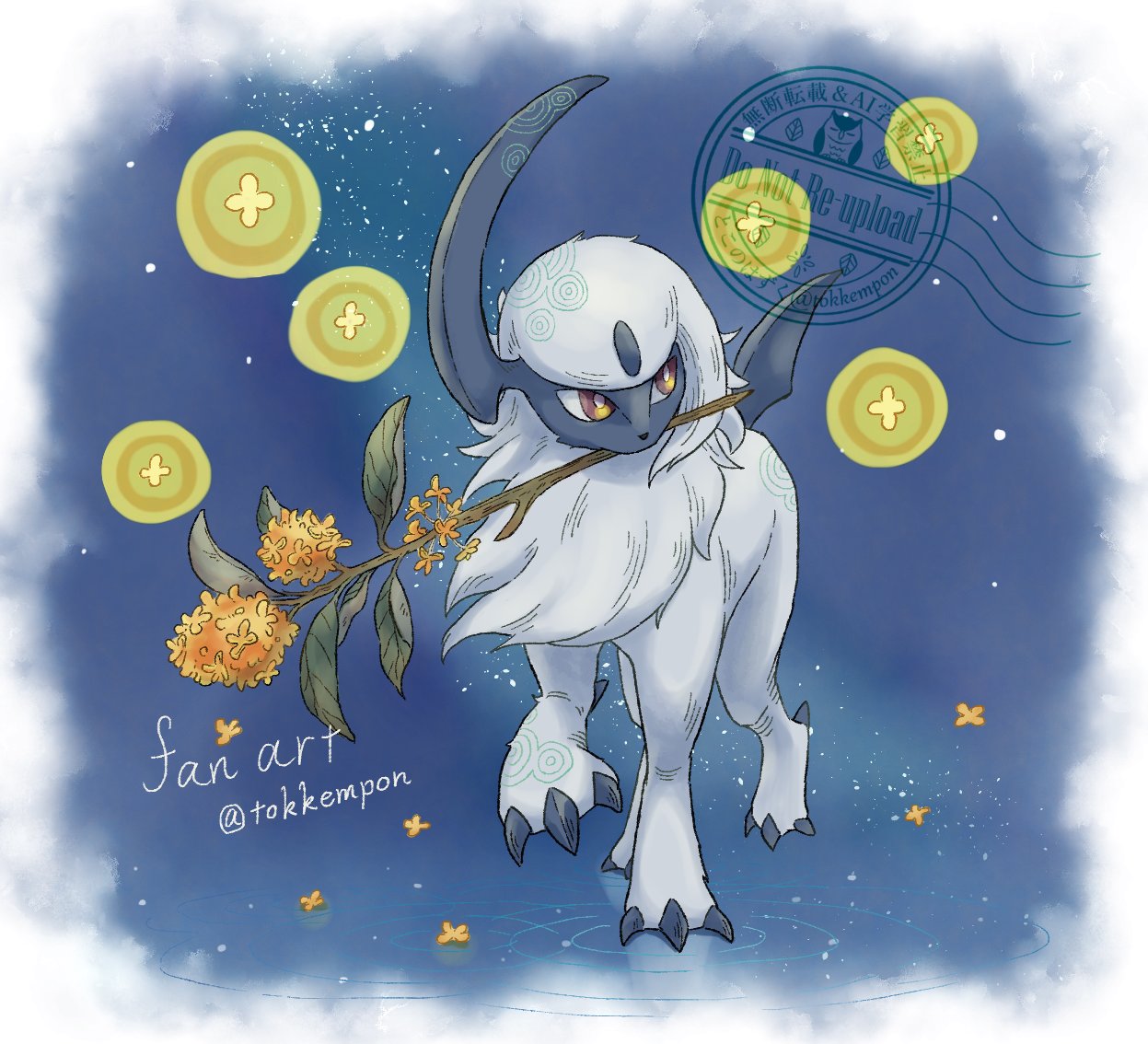 absol artist_name english_text flower gen_3_pokemon leaf looking_to_the_side nintendo no_humans orange_flower pokemon pokemon_(creature) solo tokkempon watermark white_fur