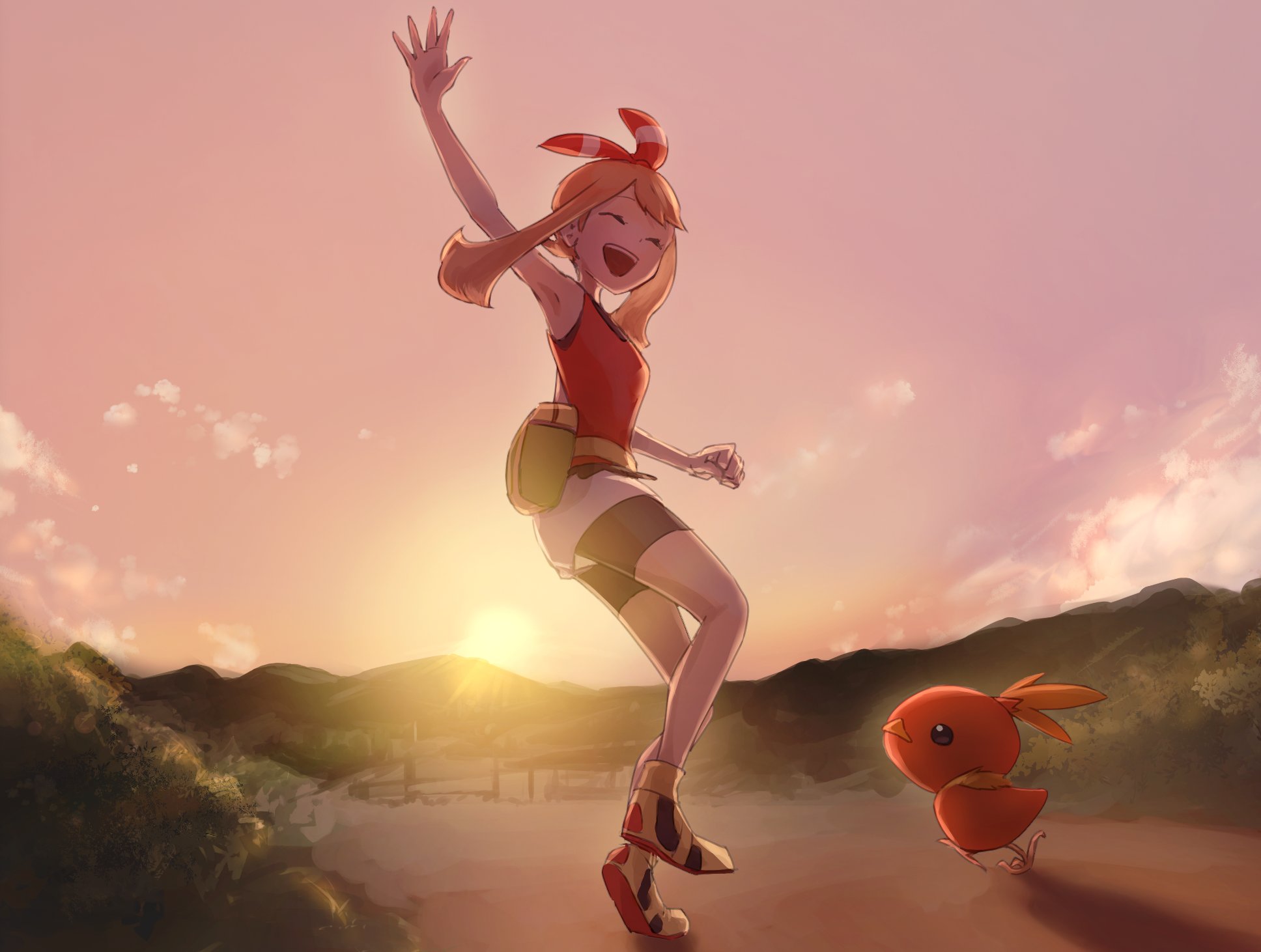 1girl arm_up armpits bike_shorts bike_shorts_under_shorts black_shorts bow bow_hairband closed_eyes cloud commentary_request fanny_pack full_body gen_3_pokemon hairband highres knr_kanra may_(pokemon) nintendo open_mouth outdoors pokemon pokemon_(creature) pokemon_omega_ruby_and_alpha_sapphire red_bow red_hairband red_shirt shirt shoes short_hair shorts sleeveless sleeveless_shirt sun sunset teeth torchic upper_teeth_only waving white_shorts