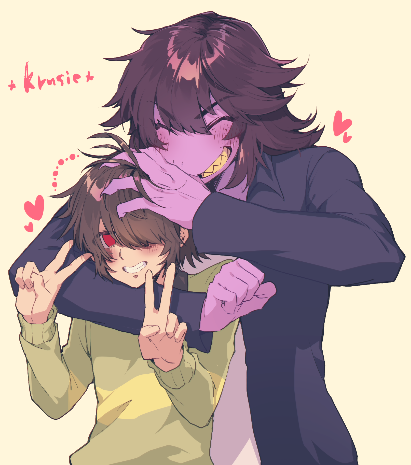 1girl 1other :d ^_^ arm_around_neck behind_another black_coat blush brown_hair closed_eyes coat colored_skin commentary_request deltarune double_v freckles furry furry_female green_sweater grin hair_between_eyes hair_flaps hair_over_one_eye hand_on_another's_head heart highres komugiko_(bitte_komu) kris_(deltarune) long_hair long_sleeves looking_at_viewer messy_hair no_pupils one_eye_covered open_clothes open_coat open_mouth puffy_long_sleeves puffy_sleeves purple_skin red_eyes reptile_girl sharp_teeth pairing_name shirt short_hair simple_background size_difference smile striped_clothes striped_sweater susie_(deltarune) sweater teeth two-tone_sweater upper_body utdr_(toby_fox) v v-shaped_eyebrows white_shirt yellow_background yellow_sweater