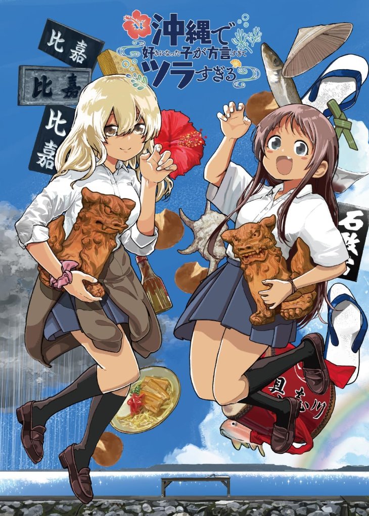 2girls black_socks blonde_hair blu-ray_cover blue_sky blush_stickers bracelet brown_cardigan brown_eyes brown_hair brown_shoes cardigan cardigan_around_waist claw_pose closed_mouth clothes_around_waist collared_shirt commentary_request copyright_name cover fang fish food grey_eyes grey_skirt hair_between_eyes hat higa_kana holding jewelry jumping kneehighs kyan_hina loafers long_hair looking_at_viewer multiple_girls nana_me ocean official_art okinawa_de_suki_ni_natta_ko_ga_hougen_sugite_tsurasugiru open_mouth pink_scrunchie pleated_skirt rainbow sandals school_uniform scrunchie shiisaa shirt shoes skirt sky smile socks straw_hat tan translation_request white_shirt wrist_scrunchie