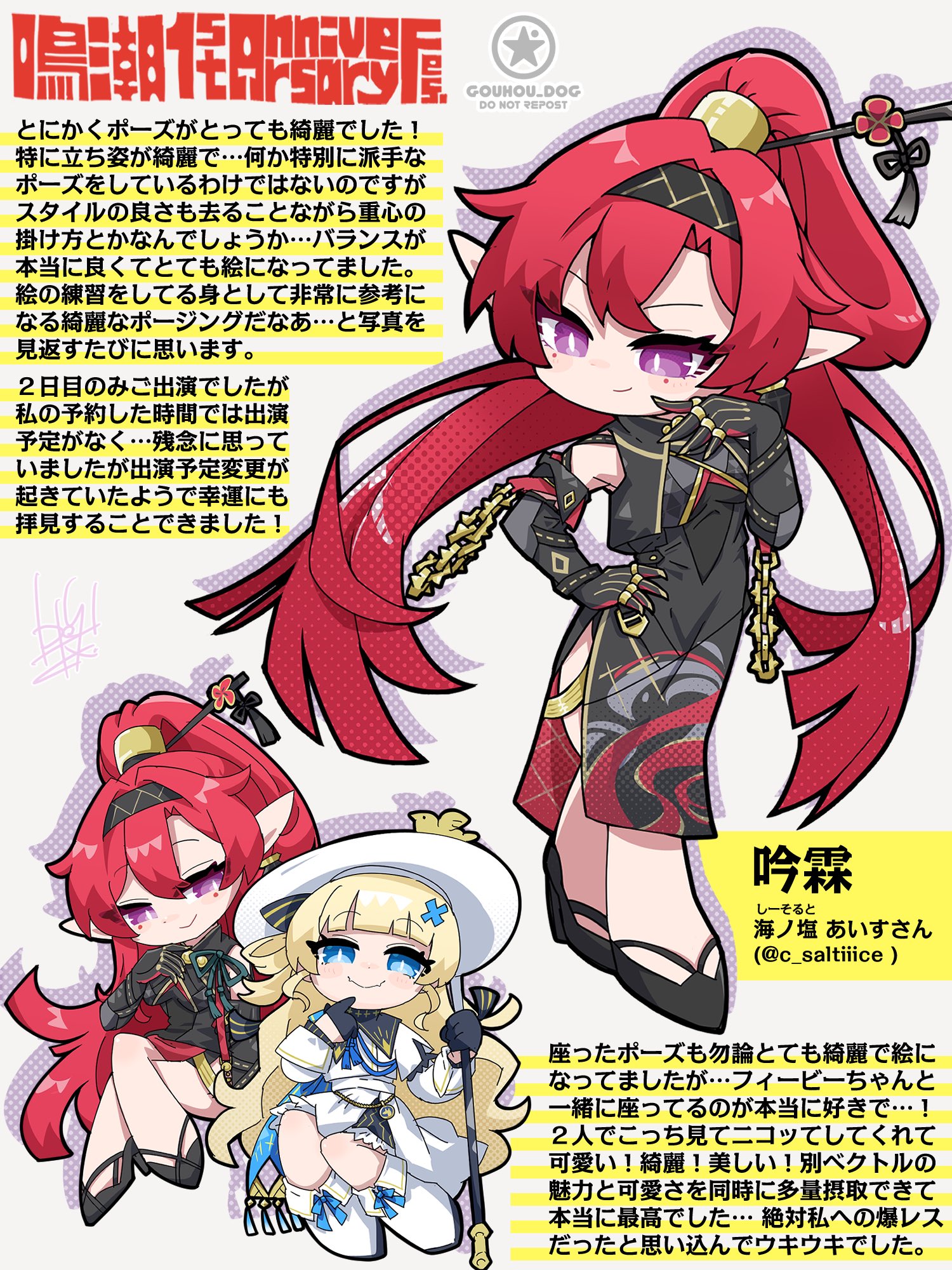 2girls bare_legs black_bodysuit black_gloves black_hairband blonde_hair blue_eyes blush bodysuit boots bright_pupils chibi chibi_only circle_facial_mark closed_mouth commentary_request crossed_legs dog-san elbow_gloves facial_mark gloves hair_ornament hair_stick hairband hand_on_own_hip hat high_ponytail highres holding holding_staff legs long_hair long_sleeves looking_at_another mark_under_both_eyes multiple_girls multiple_views pelvic_curtain phoebe_(wuthering_waves) pointy_ears ponytail purple_eyes red_hair shirt skirt smile staff translation_request very_long_hair white_boots white_hat white_pupils white_shirt white_skirt wuthering_waves x_hair_ornament yinlin_(wuthering_waves)