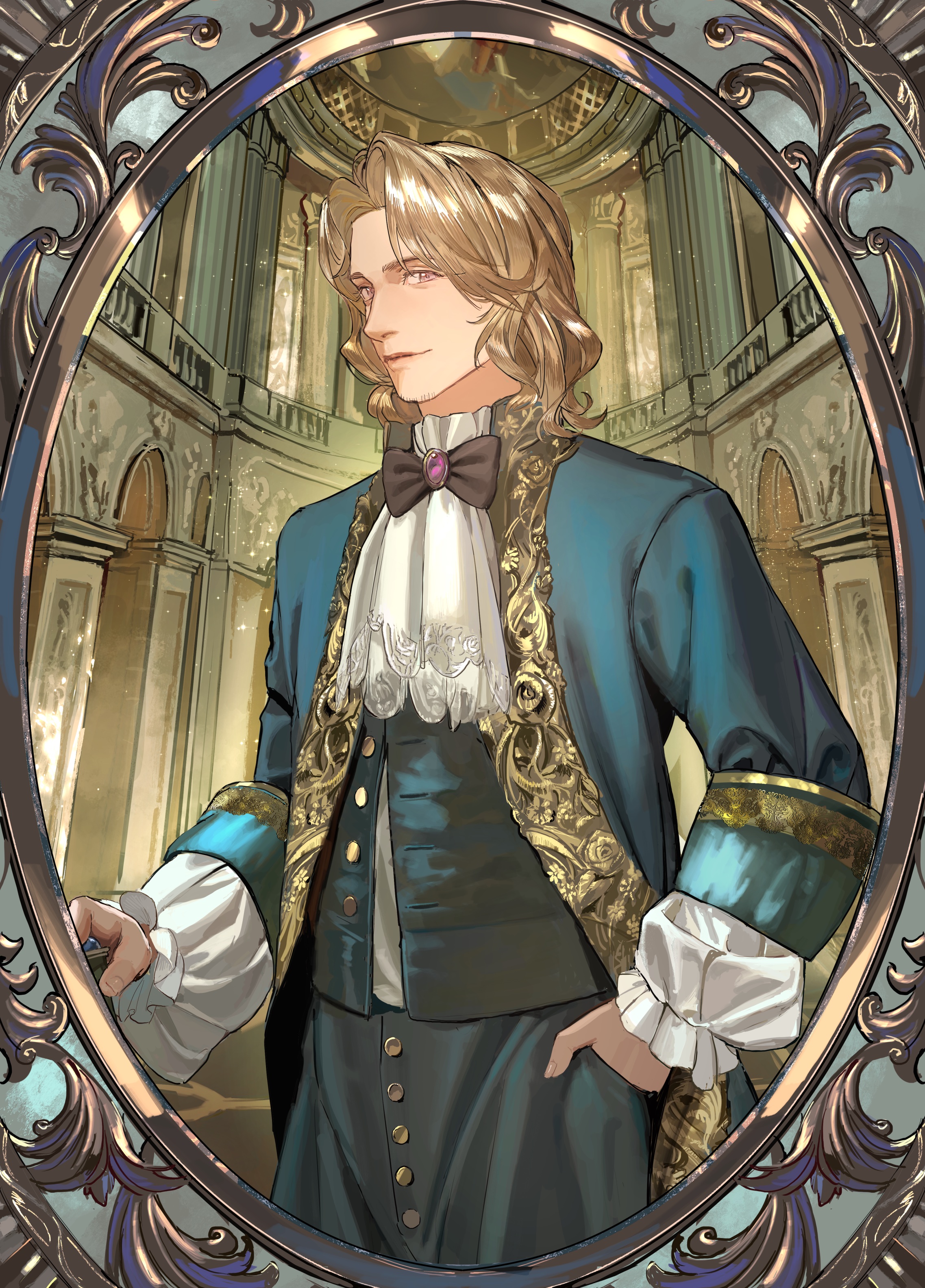1boy absurdres architecture ascot axis_powers_hetalia black_bow black_bowtie blonde_hair blue_gem blue_jacket bow bowtie buttons cane chinese_commentary closed_mouth commentary_request cowboy_shot european_architecture facial_hair fingernails floor floral_print flower_ornament formal_clothes france_(hetalia) frills gem gold_trim green_pants green_vest hand_in_pocket high-waist_pants highres holding holding_cane indoors jacket lips long_sleeves looking_at_viewer male_focus open_clothes open_jacket open_vest pants picture_frame pink_eyes puffy_long_sleeves puffy_sleeves purple_gem shirt short_hair smile solo standing vest wavy_hair white_ascot white_shirt zhongerweiyuan